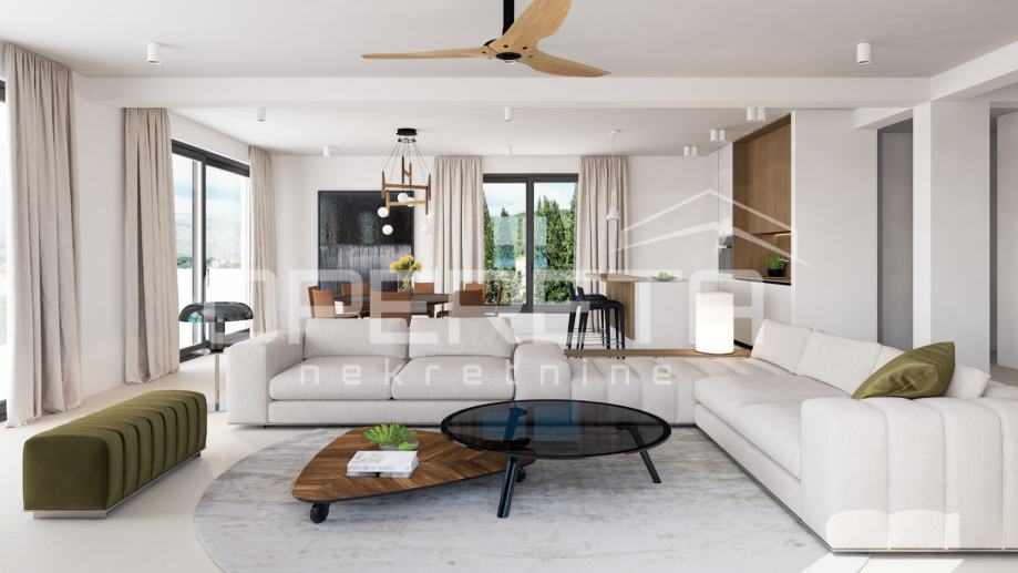Prozori od poda do stropa povezuju interijer s eksterijerom, otvarajući pogled i pristup terasi koja nudi dodatni prostor za opuštanje ili zabavu.