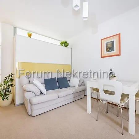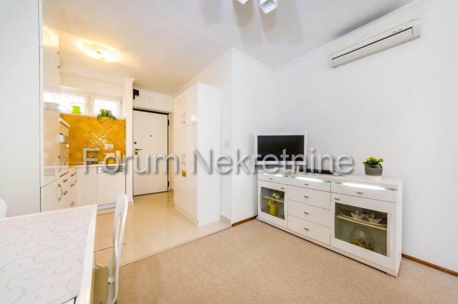 Prodajemo stan od 27,14m2 (u naravi stan ima 30m2 prostora,jer je zatvoren balkon) na petom katu (zadnjem ) zgrade, udaljene od mosta cca 150m . Izvorno prostor predstavlja garsonjeru (studio) koji je pretvoren u jednosobni stan. Zgrada nema lift. Stan je kompletno renoviran i prodaje se kompletno namješten.