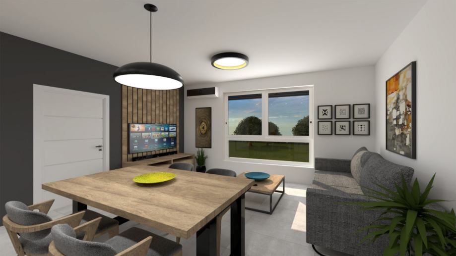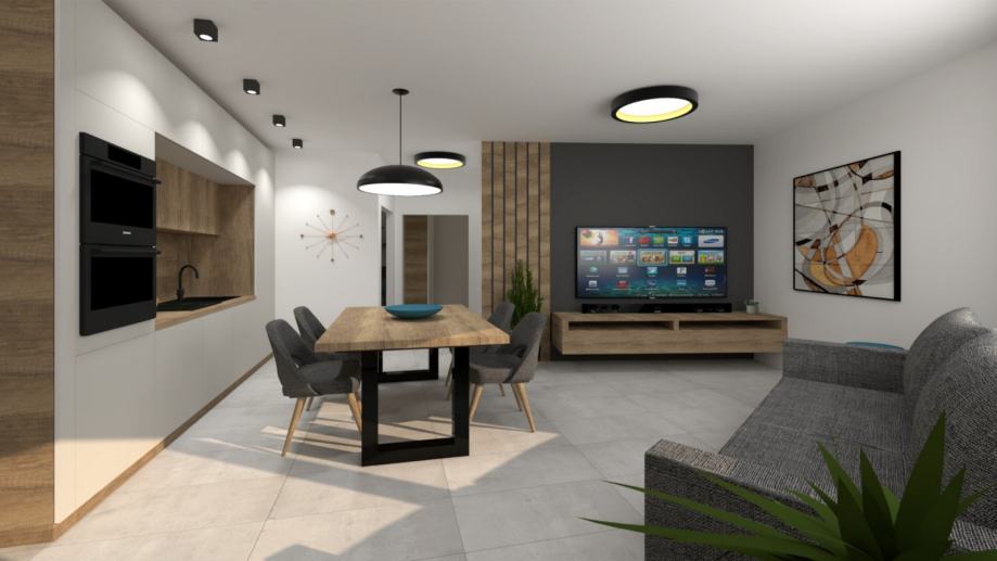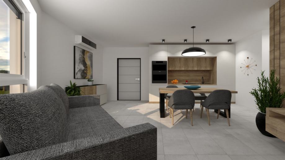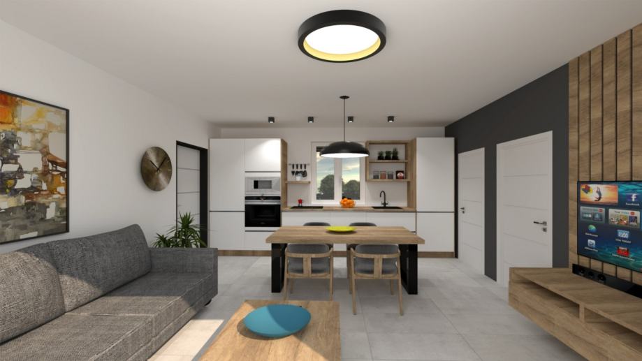Stan se sastoji od dnevnog boravka s kuhinjom, spavaće sobe, kupatila i terase, ostave u prizemlju i parkirnim mjestom ukupne neto površine 42.43 m2. Plaćanje po građevinskim situacijama.