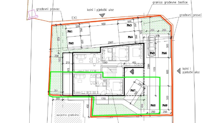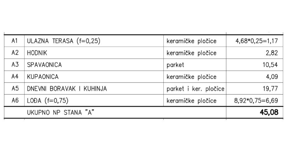 Stambeni dio površine 45.08 m² sastoji se od ulaznog prostora, spavaće sobe, dnevnog boravka s kuhinjom i blagovaonicom, kupaonice i terase. SStanu pripadaju dva parkirna mjesta i vrt površine 50 m2.