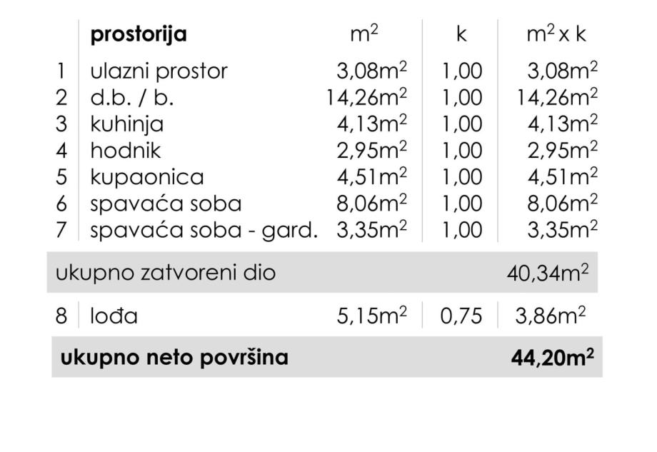 Površina stana iznosi 40,34 m2.