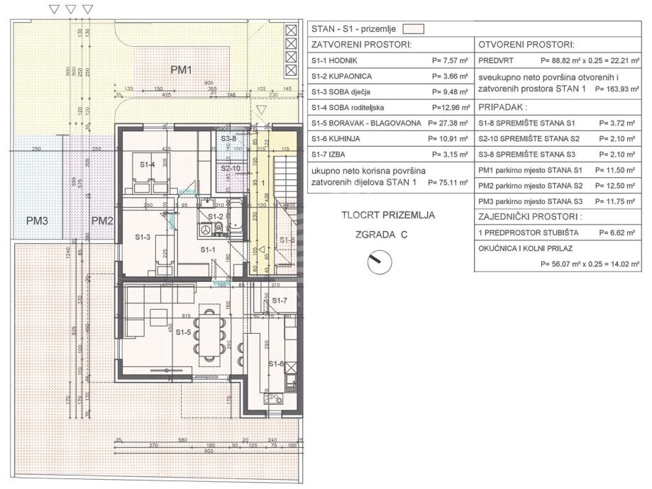 Stan C1 nalazi se u prizemlju i sastoji se od hodnika, kupaonice, dvije sobe, dnevnog boravka sa kuhinjom i blagovaonicom, ostave, vrta, spremišta i parkirnog mjesta. Ukupna prodajna površina 86,78 m2.
