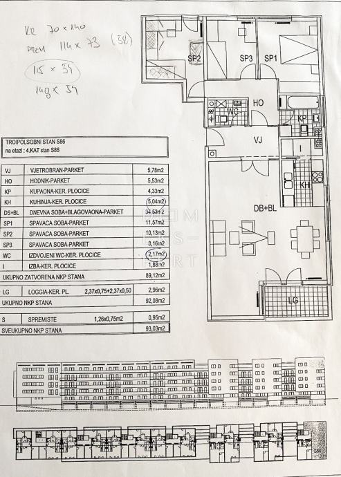Pripadci se obračunavaju prema zakonskim koeficijentima, a neto korisna površina stana iznosi 92,19 m2.