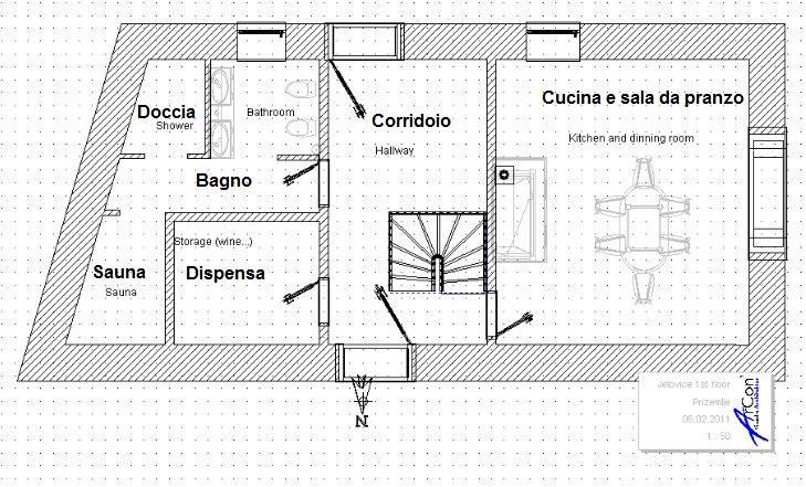 - U prizemlju se nalazi kuhinja sa blagovaonom i kaminom, kupatilo sa saunom (mini wellnes), spremište/kantina, hodnik, stepenište