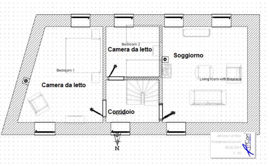 - Na katu se nalazi dnevni boravak, dvije spavaće sobe i hodnik. Moguć je komotan smještaj do 6 osoba, a uz pomoćne ležajeve i više.