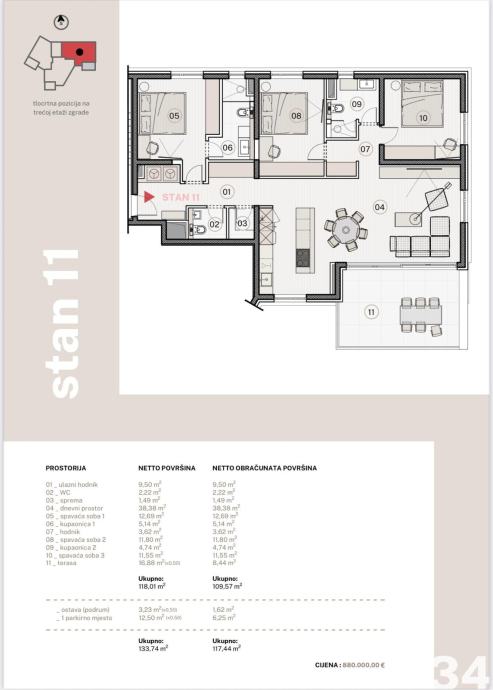 STAN 11 3. kat brutto 133,74m² netto 117,44 m² 880.000 €
