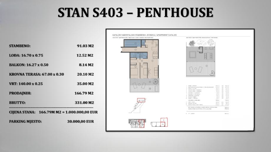 Jesenice, S403- penthouse položen na četvrtom katu zgrade u izgradnji NKP 166,79 m2. Sastoji se od dvije spavaće sobe, kuhinje, blagovaonice i dnevnog boravka otvorenog tlocrta, garderobe, dvije kupaonice, toaleta, lođe od 16,70 m2, balkona 16,27 m2 te krovne terase (67m2) s vrtom (140m2)....Za ovu nekretninu kontaktirajte agenta na broj telefona +385 91 230 0187.Više na Eurovilla.hr, ID: 740108Direktan link: https://eurovilla.hr/nekretnina/jesenice-ekskluzivan-penthouse-u-izgradnji-s-krovnom-terasom/740108/-----Jesenice, S403 - penthouse located on the fourth floor of a building under construction, NKP 166.79 m2. It consists of two bedrooms, kitchen, dining room and living room with an open floor plan, wardrobe, two bathrooms, toilet, loggia of 16.70 m2, balcony 16.27 m2 and roof terrace (67m2) with a... For this property contact our agent on telephone number +385 91 230 0187.More on Eurovilla.hr, ID: 740108Direct link: https://eurovilla.hr/en/property/jesenice-exclusive-penthouse-under-construction-with-roof-terrace/740108/...
