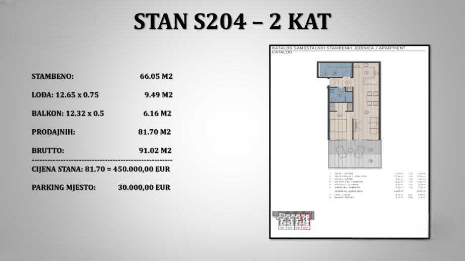 Jesenice, S204- stan položen na drugom katu zgrade u izgradnji NKP 81,70 m2. Sastoji se od jedne spavaće sobe, kuhinje, blagovaonice i dnevnog boravka otvorenog tlocrta, kupaonice, lođe od 9,49 m2 i balkona 6,16 m2. Pripada mu i spremište. Orijentacija jug-istok.Mogućnost kupnje garažnog...
