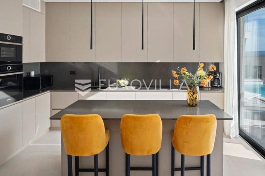 Jesenice, suvremena dvojna vila s lijepim pogledom na more. Proteže se na tri etaže, neto korisne površine 222 m2. Sastoji se od dnevnog boravka, kuhinje i blagovaonice otvorenog koncepta, 3 spavaće sobe, 2 kupaonice i jednog toaleta te lijepe terase s bazenom i sunčalištem.Velika kuhinja s...