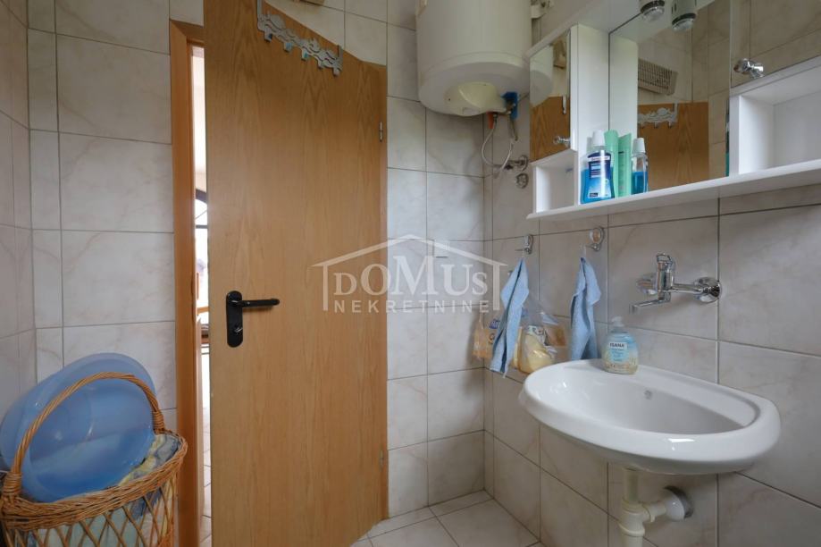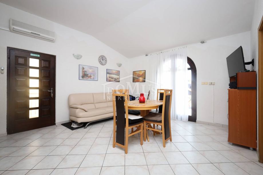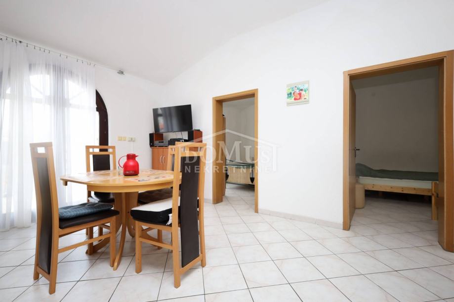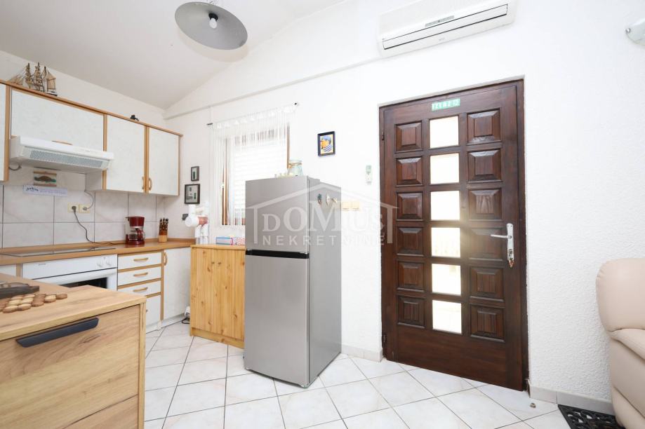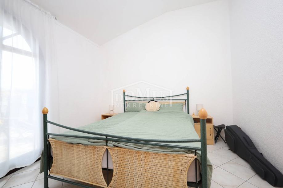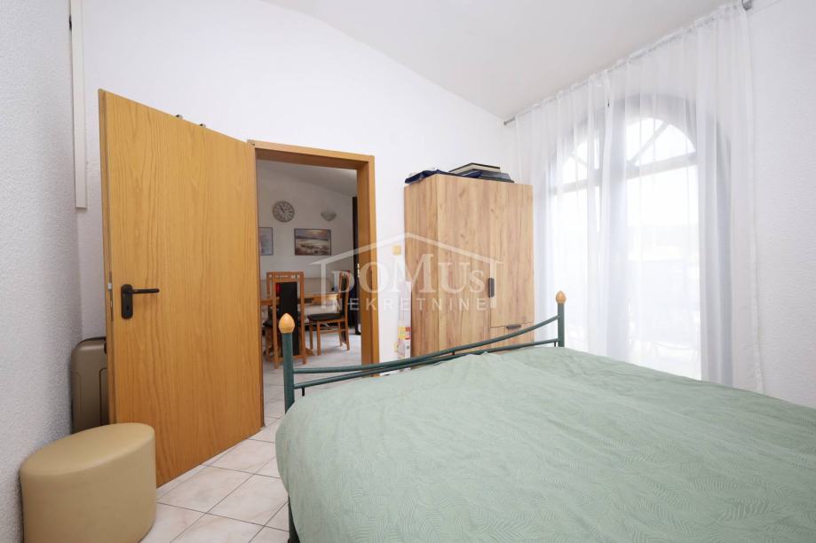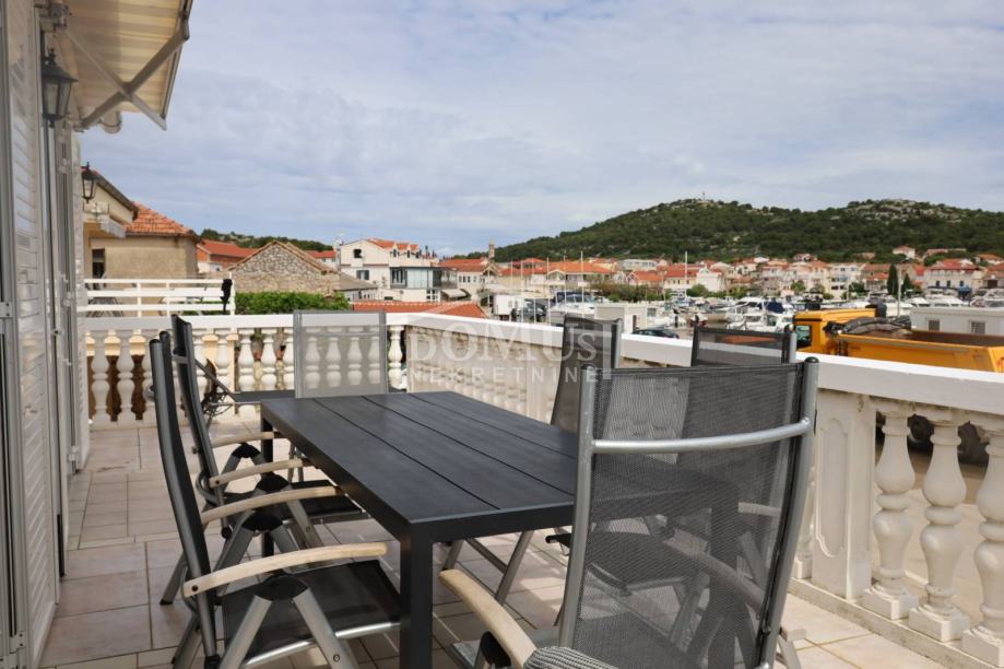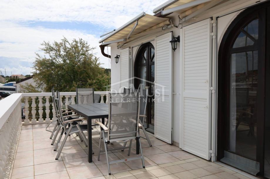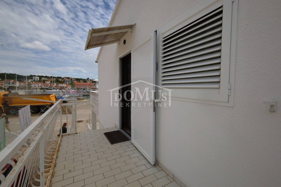 Jezera na otoku Murteru, u 1. redu do mora, u centru mjesta s pogledom na more i marinu. Etaža manje kuće / stan od 62,12 m² korisne površine nalazi se na prvom katu, s pripadajućim dvorištem. Stan se sastoji od vanjskog stubišta, podesta, otvorenog dnevnog boravka s kuhinjom i blagovaonicom, kupaonice, dvije spavaće sobe te terase površine 22,50 m² s koje se pruža neometan pogled na more, marinu i cijelo mjesto. Stanu pripada dio okućnice od 39 m², koji je dostatan za dva vozila. Stan je odmah useljiv, u potpunosti namješten, a namještaj je uključen u cijenu nekretnine.