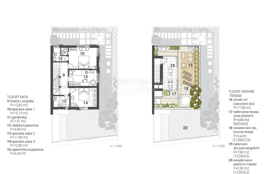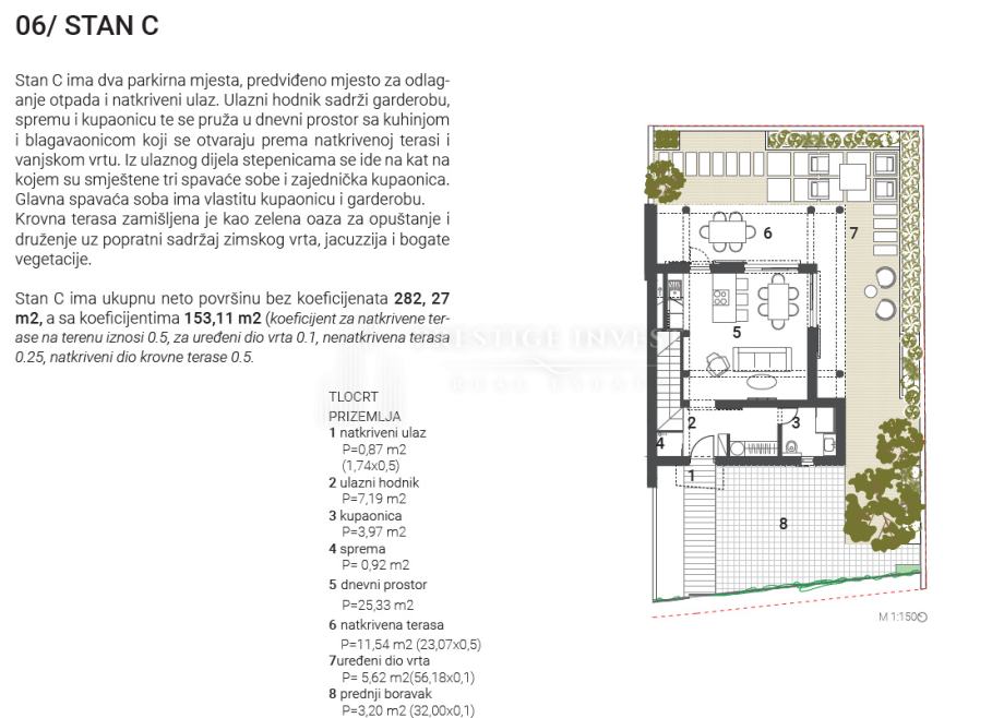 Ukupna površina jedinice je 282m2, te je neto površina 153m2.