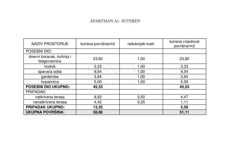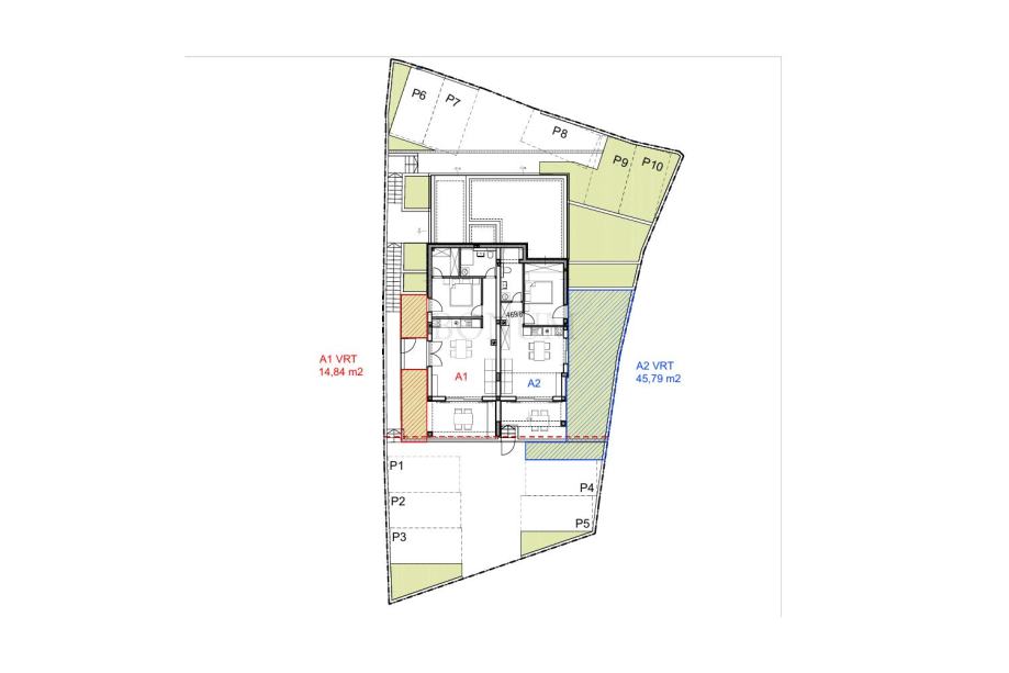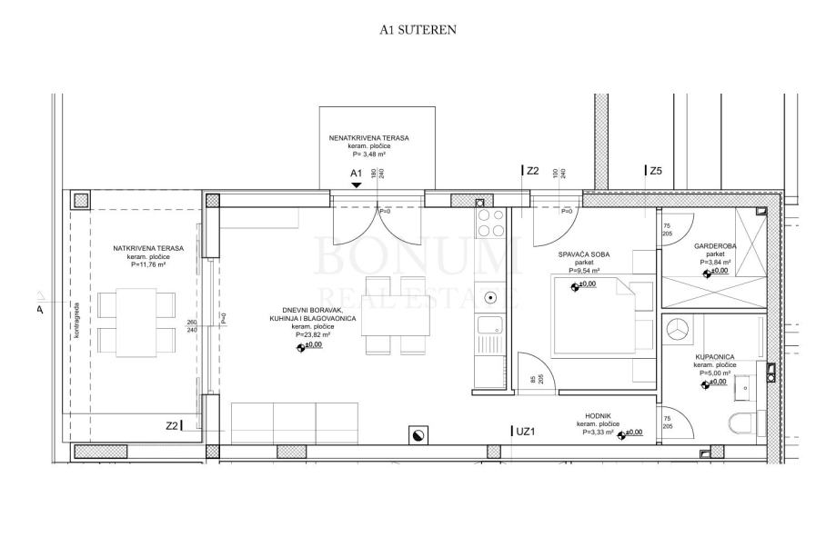 Stan A1 uključuje jednu spavaću sobu s garderobom, kupaonu, dnevni boravak s kuhinjom i blagovaonicom te lijepu natkrivenu terasu i vrt od 14.84 m2.. Zgrada ima ukupno 8 stanova, a početak gradnje je predviđen za jesen 2024., s useljenjem u proljeće 2026. Oprema stana uključuje keramiku do 35 €/m², kupaonsku opremu u vrijednosti od 1500 €, klimatizaciju u svakoj prostoriji, pripremu za podno grijanje putem dizalice topline na vodu, sobna vrata do 500 € po komadu, komarnike na svim otvorima i ISO stakla.