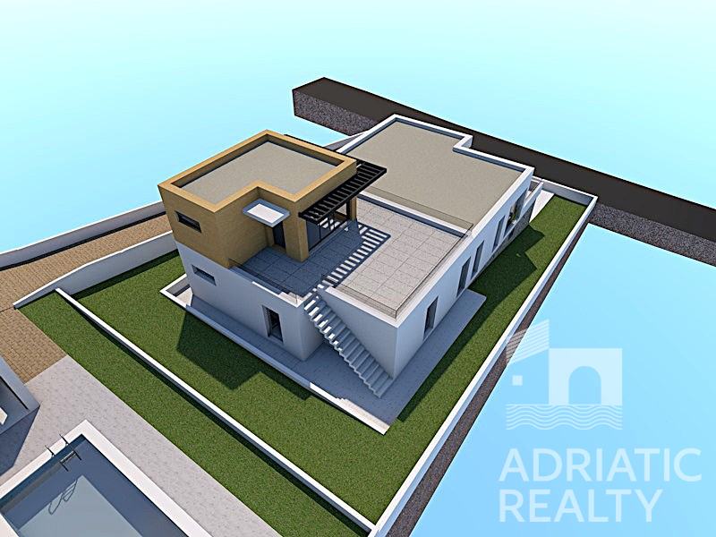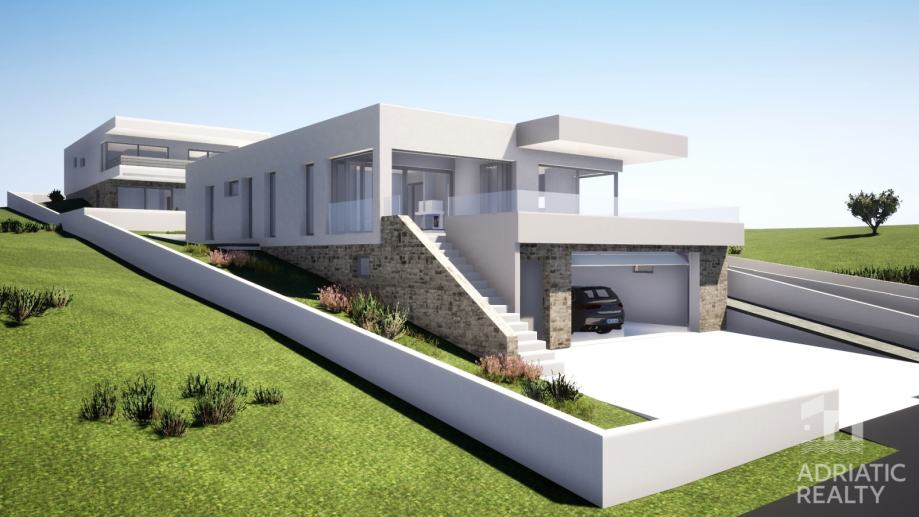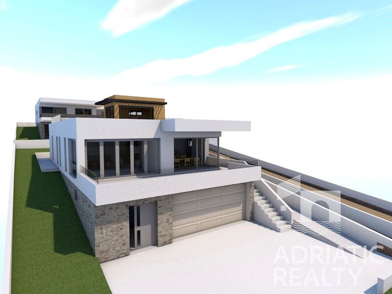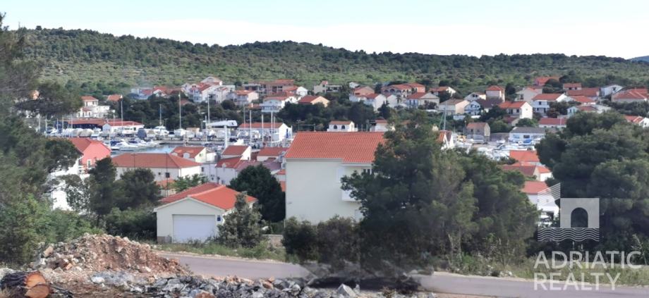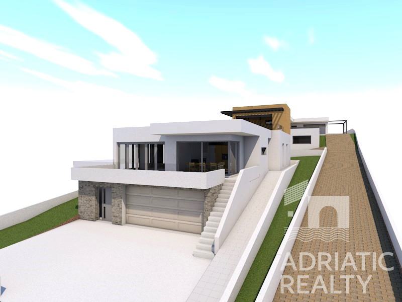 Na prodaju je građevinsko zemljište s ishođenom građevinskom dozvolom, smješteno na mirnoj lokaciji, na uzvisini s južnom orijentacijom. Ova atraktivna pozicija osigurava prekrasan pogled na obližnja mjestoi marinu te pruža savršenu ravnotežu između privatnosti i blizine svih potrebnih sadržaja.