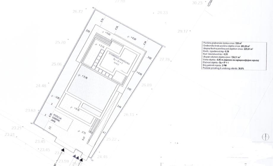 Vlasnici su ishodovali građevinsku dozvolu za gradnju moderne obiteljske kuće koja se prostire na tri etaže: suteren, prizemlje i krovnu terasu. U suterenu su predviđeni garaža i tehnička prostorija. Prizemlje je zamišljeno kao prostrani stan koji obuhvaća kuhinju, blagovaonicu i dnevni boravak otvorenog koncepta, tri spavaće sobe, dvije kupaonice i praonicu. Vanjskim stubištem dolazi se do prostrane krovne terase, na kojoj je predviđena ljetna kuhinja – idealno mjesto za opuštanje i uživanje u panoramskom pogledu.