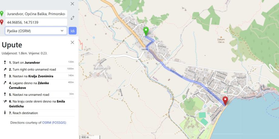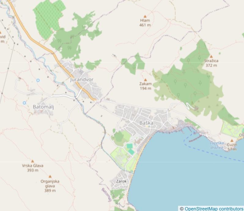 Udaljenost od Baške i mora je 1,6 km što je 20 min laganog pješačenja ili 4min vožnje do Baške.