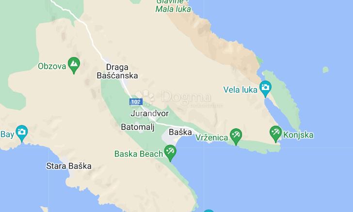 Teren je dosta strm, obrastao autohtonim raslinjem, od asfaltirane ceste za Bašku udaljen cca 550m, a od mora 2.800m. Idealan za vinogradstvo i uzgoj smokvi.