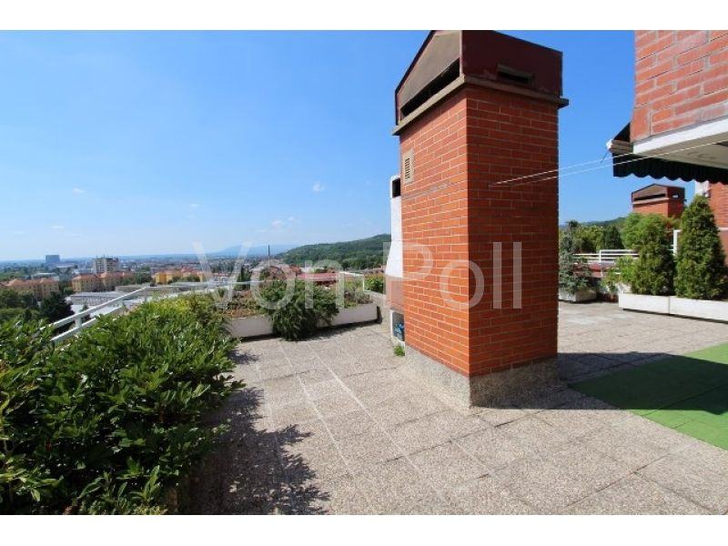 Krasan prostrani stan na Kajfešovom brijegu od 144,35m2 s terasom od 72m2, nalazi se u prizemlju. Orijentiran na zapad s fascinantnim pogledom na grad.Sastoji se od ulaznog hodnika, 4 sobe, kuhinje, dnevnog boravka s blagovaonicom i izlazom na terasu (72m2), dvije kupaonice s wc-om, predsoblja, te gospodarskog prostora od 30m2 na doljnjoj etaži. Uz stan se prodaje garaža od 14m2 koja je u cijeni stana.Blizina vrtića, osnovne škole, javnog prijevoza (7min hoda do tramvaja).