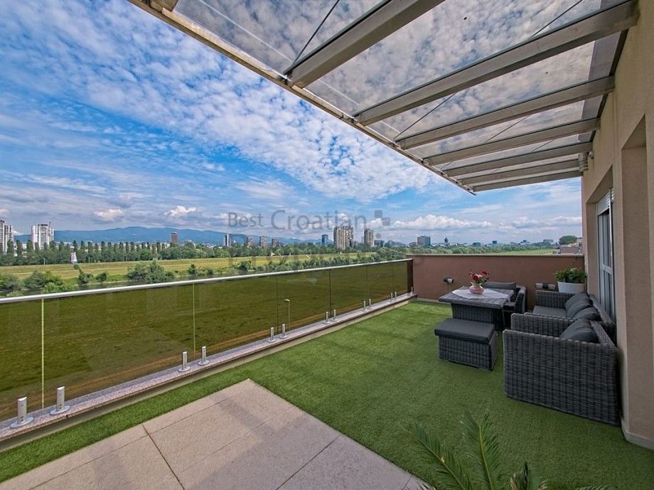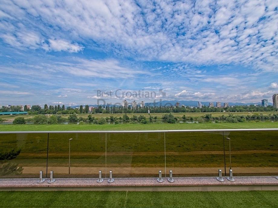 Ovaj penthouse nalazi se u manjoj, novijoj zgradi smještenoj uz Savski nasip, a sastoji se od komfornog dnevnog boravka sa velikim staklenim stijenama, zahvaljujući kojima je stan izrazito svijetao i ugodan, te izlazom na predivnu, uređenu terasu s pogledom na rijeku Savu.