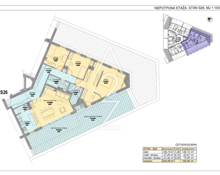 Prodaje se PENTHOUSE na nepotpunoj etaži- JEDINI ovakve kvadrature, a u naravi je četverosoban stan neto stambene kvadrature 166,98 m2, a stvarne podne površine čak 204,89 m2!