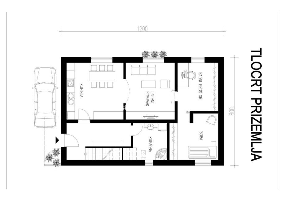 U prizemlju su jako zgodno raspoređeni: predsoblje sa stepeništem na kat, kuhinja s blagovaonicom, dnevni boravak, jedna radna i jedna mala spavaća soba. Na katu je predsoblje s tri komotne spavaće sobe. Kuća je useljiva i prodaje se namještena. Ukoliko bi se kupac odlučio za adaptaciju, moguće ju je povisiti do točke koju je dosegnula susjedna kuća u skladu s odredbama prostornog plana koji dozvoljava interpolaciju u staroj jezgri.