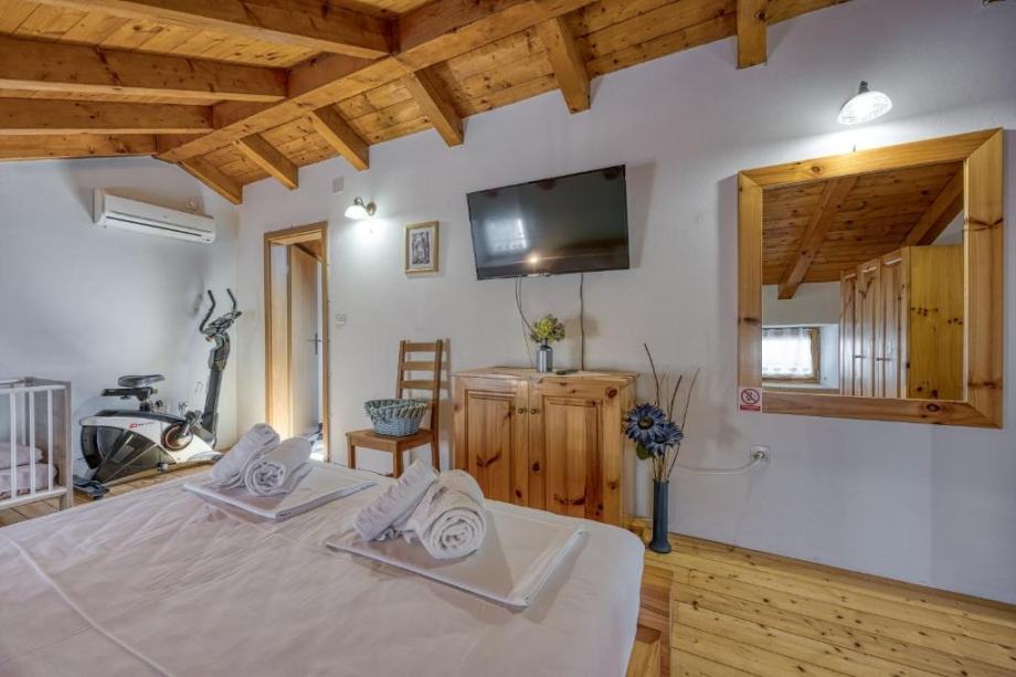 Na prizemnoj etaži nalazi se open space dnevni boravak s kuhinjom i blagovaonom , jedna velika spavaća soba te kupaona dok se unuratnjim stepeništem penjemo na kat gdje se nalaze još tri spavaće sobe od kojih je jedna s vlastitom kupaonom te još jedna ekstra kupaona za druge dvije sobe.. Svaka soba ima klima uređaj , a u zimskim danima možete se zagrijati i kraj kamina .