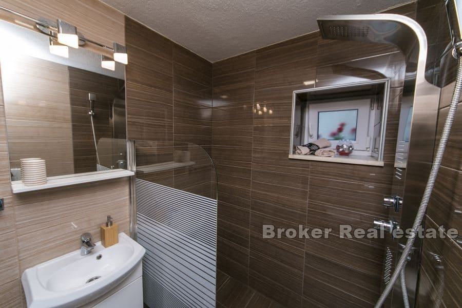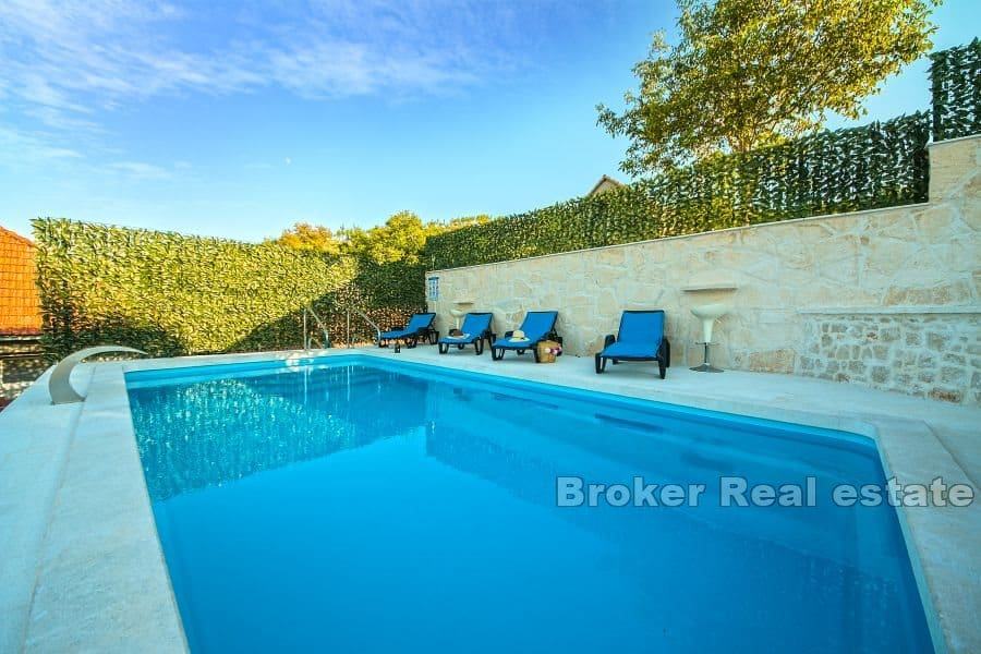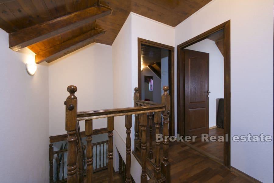 Prizemlje se sastoji od dnevnog boravka kuhinje, blagovaonice i kupatila ukupne stambene površine 35 m2. Na prvome katu se nalaze dvije spavaće sobe sa kvadraturom od 35 m2. Površina konobe iznosi 27 m2. U svim prostorijama su klima uređaji. Naglasak je prebačen na vanjski prostor koji je idealan za odmor u vrelim ljetnim danima. Cijela nekretnina je sagrađena na neravnome terenu što je riješeno kaskadnim etažama. Bazen i ležaljke se nalaze na uzvišenome. Ispod se nalaz konoba i veliki slobodan prostor.