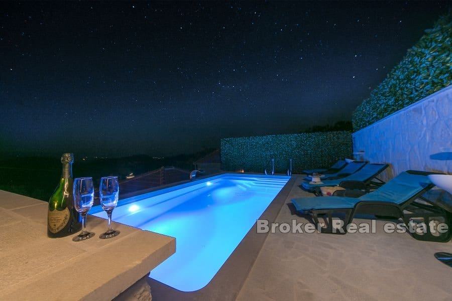 Moderno uređen interijer i eksterijer, veliki bazen, ležaljke, konoba s kominom i puno slobodnog prostora ispred kuće samo su neke od prednosti koje ovu nekretninu čine primamljivom ponudom.