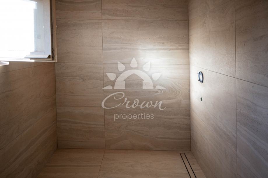 Kuća raspolaže s tri udobne spavaće sobe i dvije moderno uređene kupaonice. Interijer je osmišljen s naglaskom na funkcionalnost i ugodan boravak tijekom cijele godine. Podno grijanje omogućuje toplinu i komfor u hladnijim mjesecima, dok su klima uređaji postavljeni u svim sobama kako bi se osigurala ugodna temperatura tijekom ljetnih dana. Dodatno, u sklopu kuće bit će izdvojena sauna s WC-om, što pruža dodatnu razinu opuštanja i luksuza.