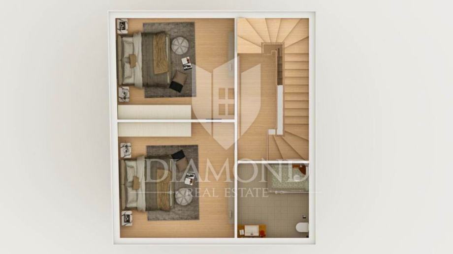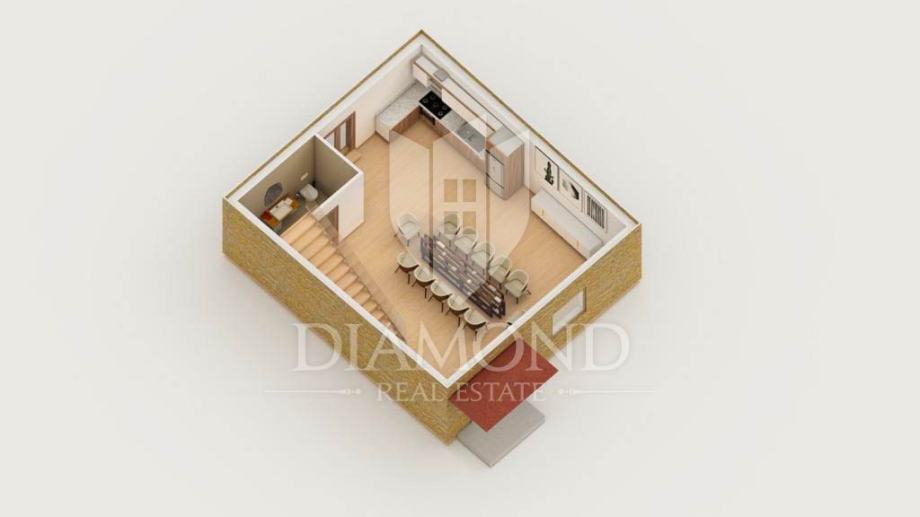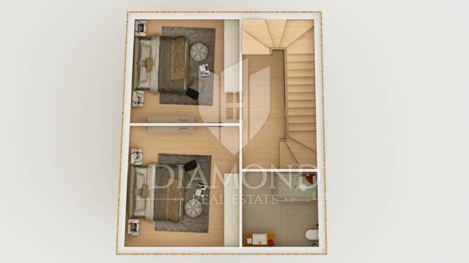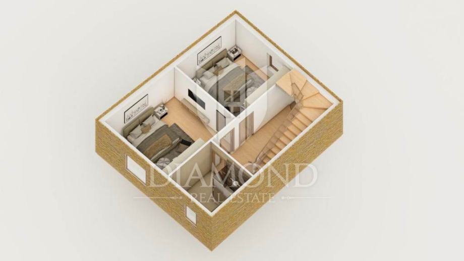 Ova kuća se sastoji od tri etaže gdje se u prizemlju nalazi kuhinja, blagovaonica i dnevni boravak te manji wc. Iz tog prostora izlazi se na stražnji dio okućnice gdje se nalazi bazen, sunčalište i terasa. Na prvom odnosnom drugom katu nalaze se po dvije spavaće sobe i po jedna kupaonica. Ovoj kući pripadaju i dva pomoćna objekta od kojih je jedan garaža površine 26m2 dok je drugi površine 13m2.