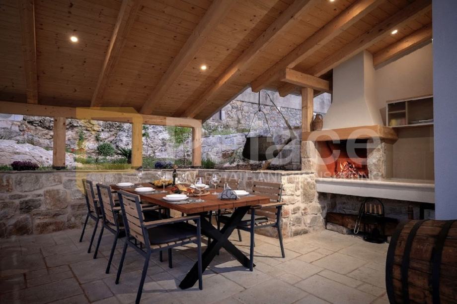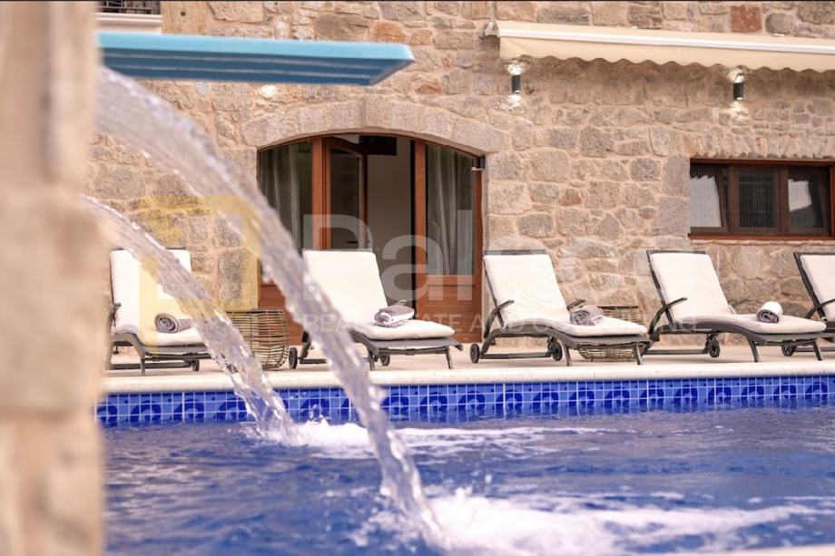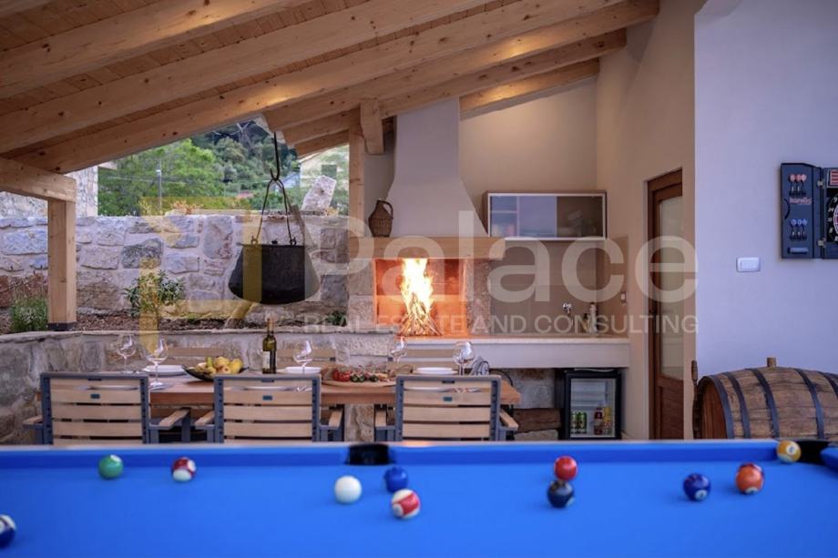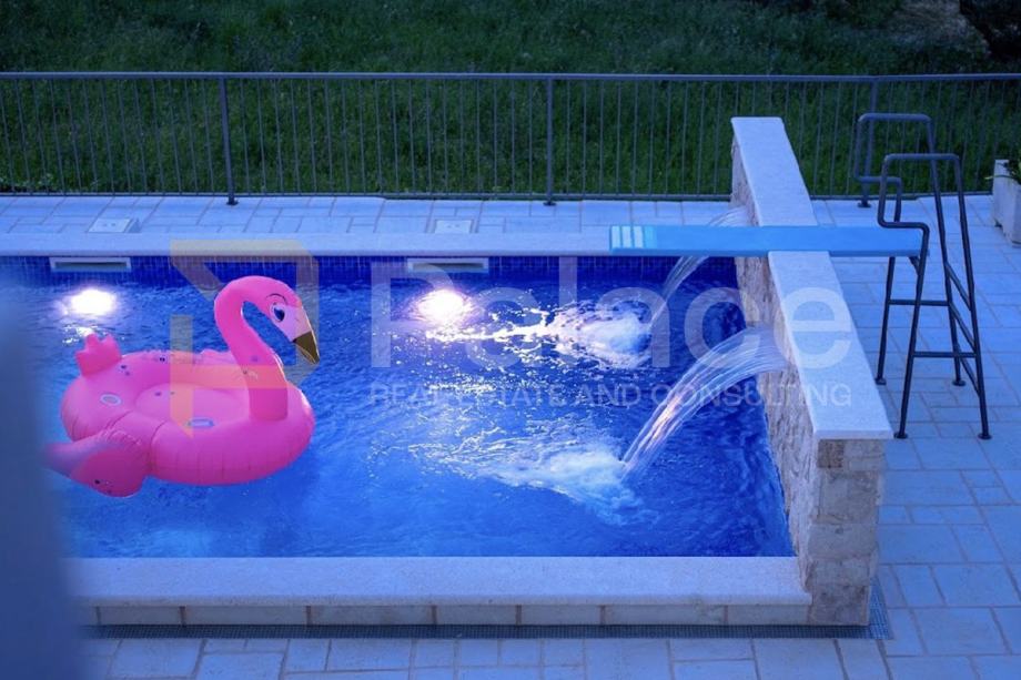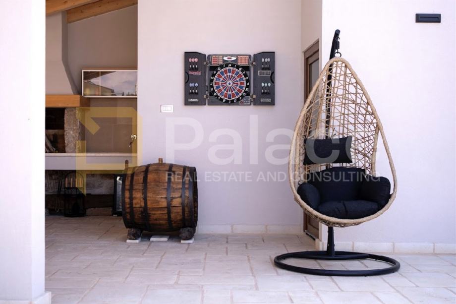 Na terasi se nalaze bazen, sunčalište i pomoćni objekt. Bazen ima ugrađene pumpe za grijanje i hlađenje. Kroz cijelu kuću provedeno je centralno grijanje.