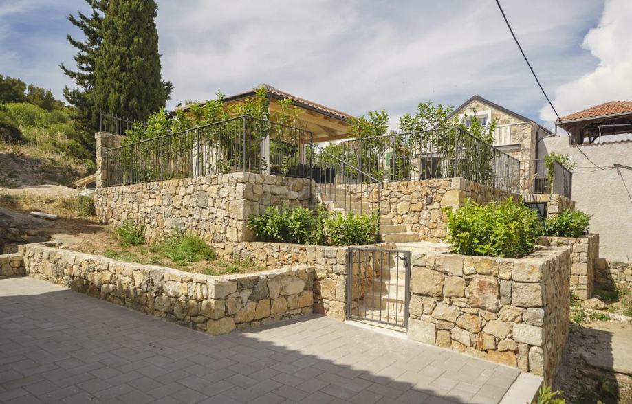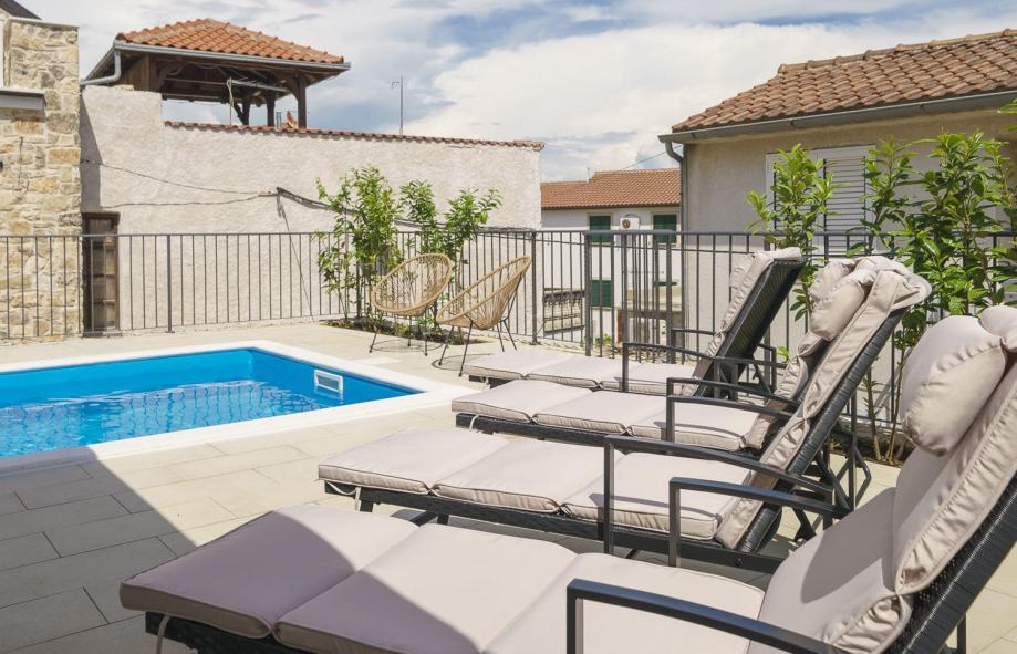 Posebna prednost ove nekretnine je prekrasan vanjski prostor s bazenom, okružen mediteranskim vrtom i prostranim sunčalištem, kao i natkrivenim prostorom s roštiljem, idealnim za uživanje u toplim ljetnim večerima.