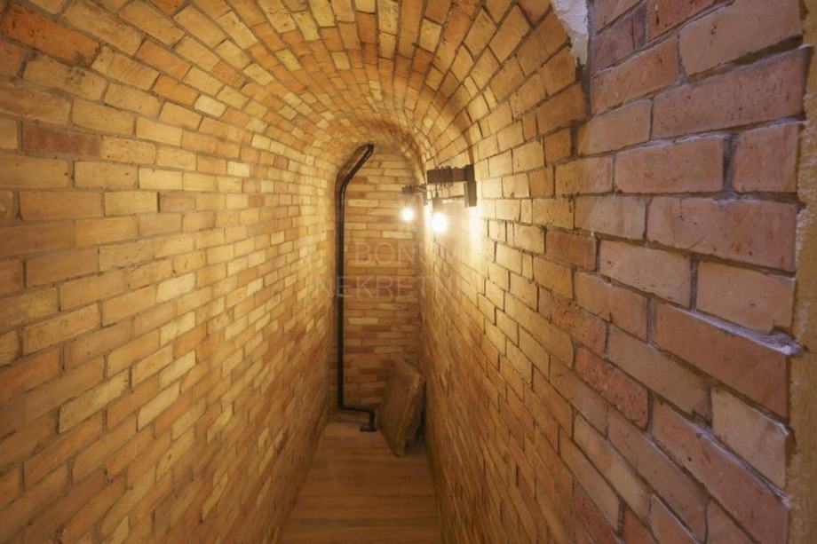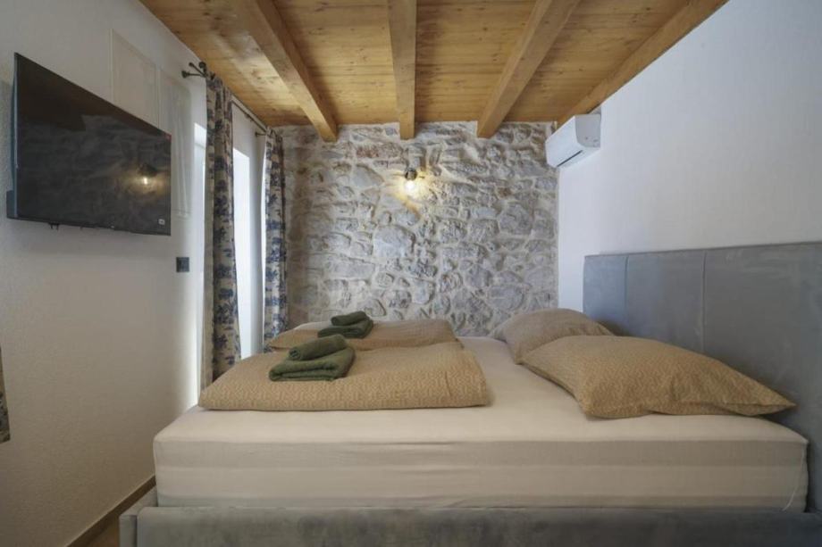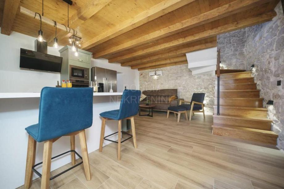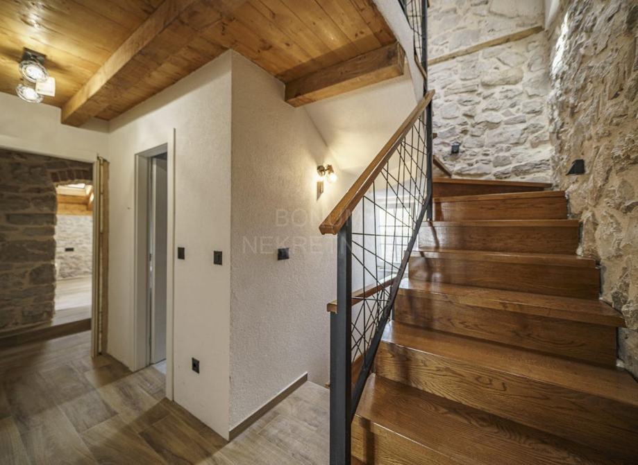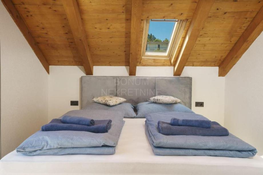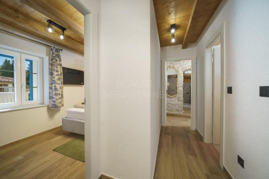 Prizemlje obuhvaća prostranu kuhinju s blagovaonicom i dnevnim boravkom, vinoteku, WC i ostavu. Blagovaonicu krasi veliki zidani kamin, savršen za obiteljska druženja i večere. Unutarnje stubište vodi na kat gdje se nalaze dvije prozračne spavaće sobe, svaka s privatnom terasom, te moderna kupaonica. U visokom potkrovlju smještena je prostrana glavna spavaća soba s vlastitom kupaonicom i izlazom na terasu s koje se pruža pogled na dvorište, bazen i more.