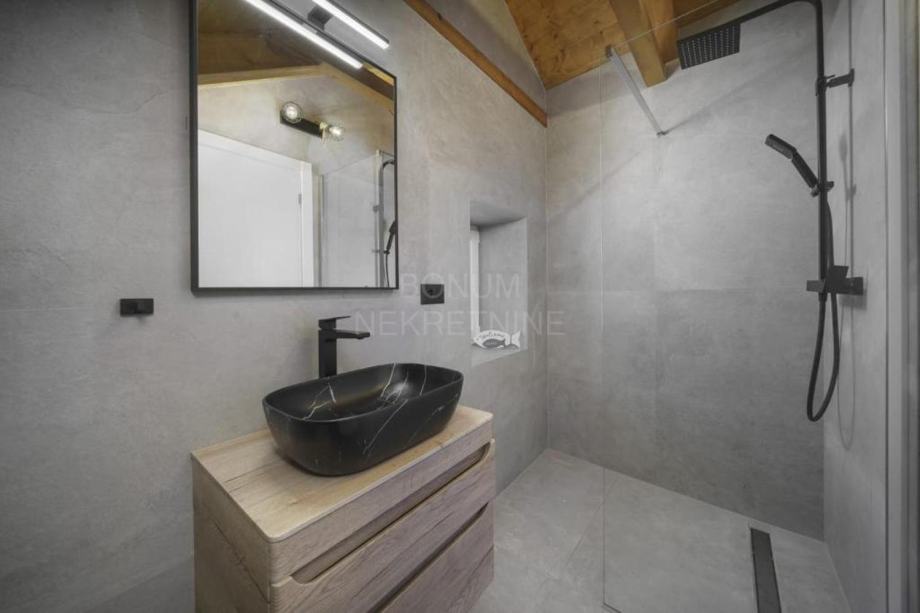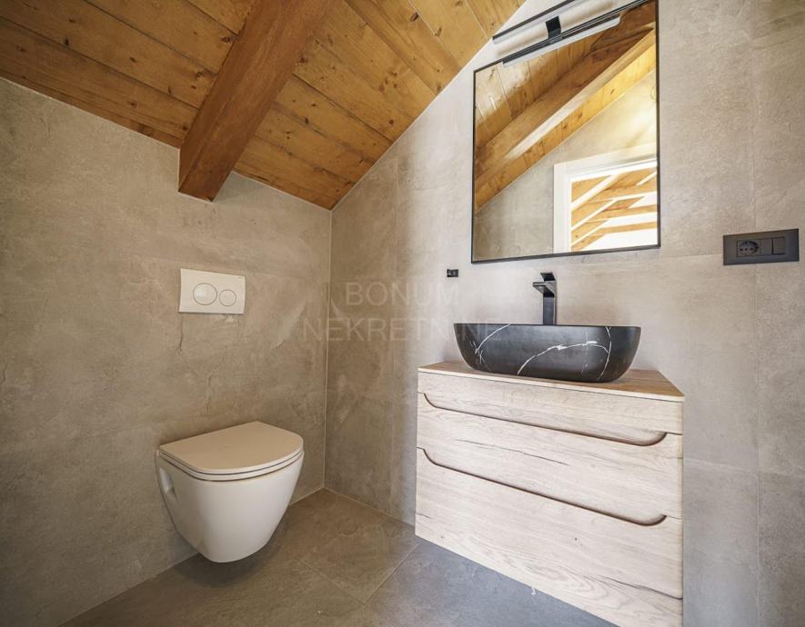 Cijela kuća opremljena je podnim grijanjem i klimatizacijom u svim prostorijama, a prodaje se potpuno namještena, s namještajem izrađenim po mjeri.