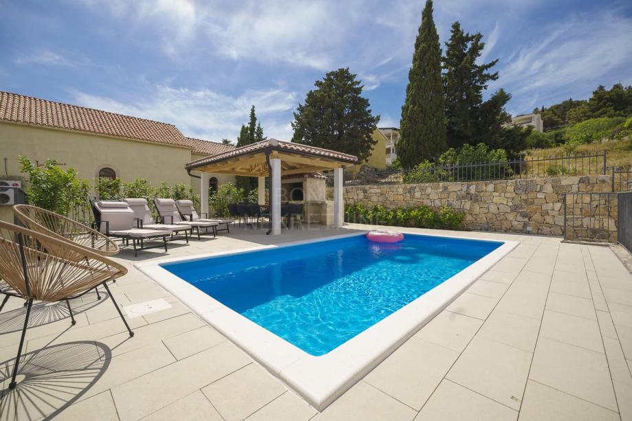 Posebna prednost ove nekretnine je prekrasan vanjski prostor s bazenom, okružen mediteranskim vrtom i prostranim sunčalištem, kao i natkrivenim prostorom s roštiljem, idealnim za uživanje u toplim ljetnim večerima.