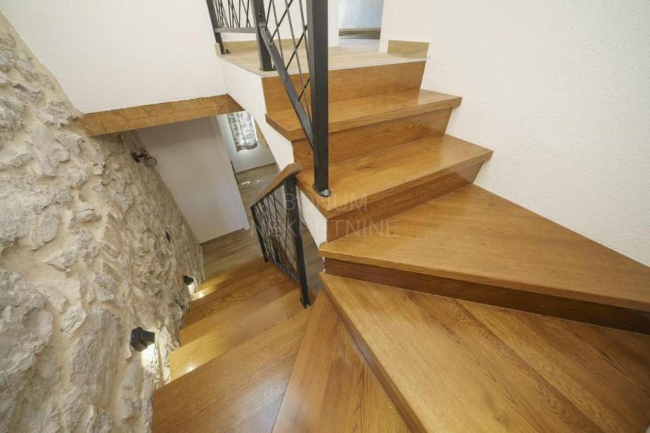 Prizemlje obuhvaća prostranu kuhinju s blagovaonicom i dnevnim boravkom, vinoteku, WC i ostavu. Blagovaonicu krasi veliki zidani kamin, savršen za obiteljska druženja i večere. Unutarnje stubište vodi na kat gdje se nalaze dvije prozračne spavaće sobe, svaka s privatnom terasom, te moderna kupaonica. U visokom potkrovlju smještena je prostrana glavna spavaća soba s vlastitom kupaonicom i izlazom na terasu s koje se pruža pogled na dvorište, bazen i more.