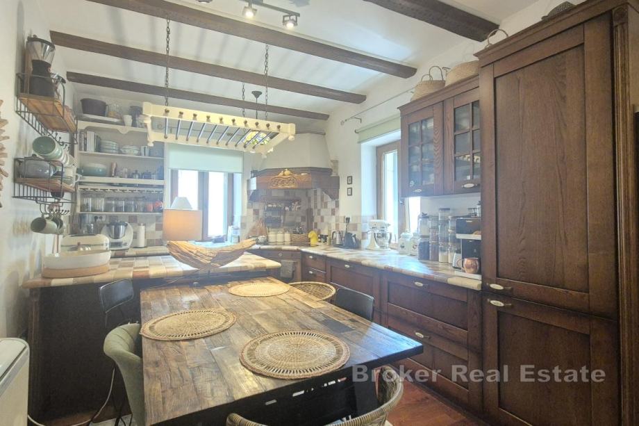 U prizemlju se nalazi studio apartman s vlastitim ulazom. Iznad njega je apartman koji se proteže kroz tri razine. Na prvoj su kuhinja, blagovaonica i kupaonica, na drugoj su dnevni boravak i jedna spavaća soba, a na trećoj se nalazi još jedna spavaća soba i terasa s pogledom na stari dio grada i djelomičnim pogledom na more.