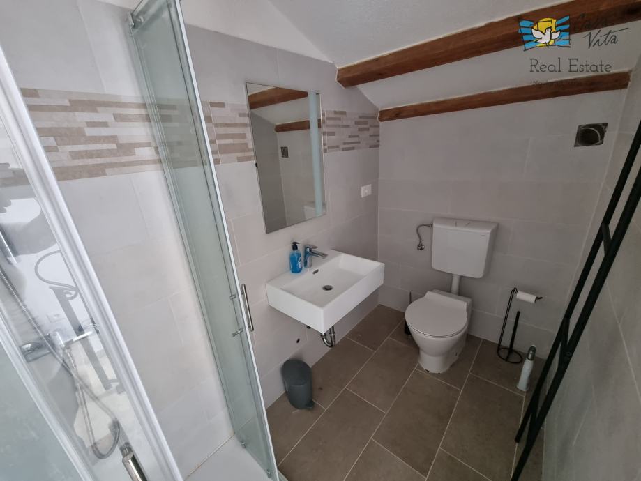 Sastoji se od tri etaže: prizemlja, prvog kata i visokog potkrovlja. U prizemlju se nalazi blagovaone, kuhinja, veliki dnevni boravak sa kamenom te kupaona. Unutarnjim stepenicama se odlazi na kat gdje su dvije spavaće sobe (jedna veća i jedna manja), te kupaona. Iz veće sobe se izlazi na prostran balkon sa kojeg se pruža otvoreni pogled na more i prirodu, a povezan je vanjskim stepenicama i sa vrtom.
