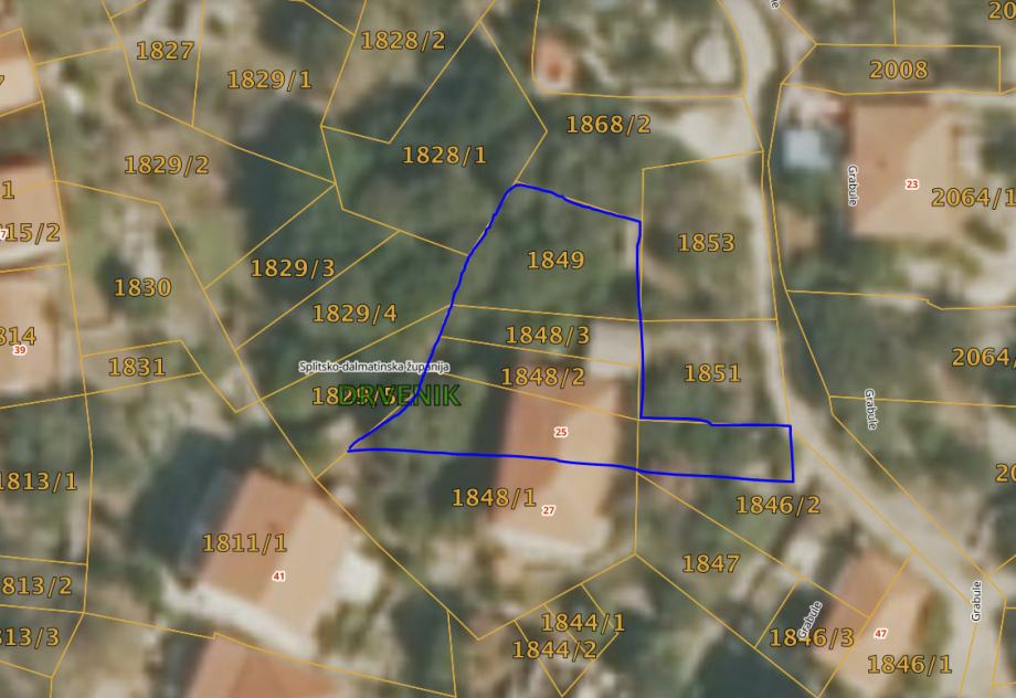 Kuća (oznaka 25) se nalazi na katastarskoj čestici 1848/1 (za 1/2), 1846/2 (za1/2) i katastarska čestica 1848/2, 1848/3 i 1849 koje su uključene u prodaju. 25.10.2025 obavljena katatarska izmjera za formiranje jedinstvene katastarske čestice označene plavom bojom na posljednjoj slici u oglasu. Površina okućnice oko 400m2.