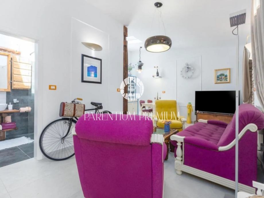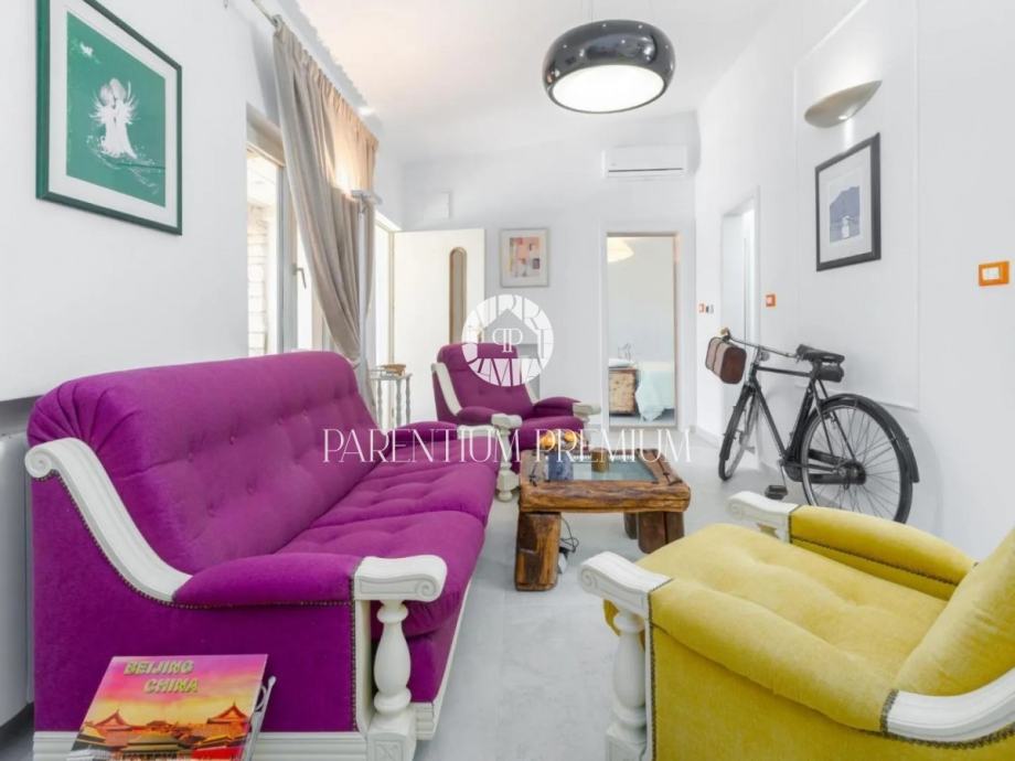 Drugi stan u prizemlju se sastoji od ulaznog hodnika, kupaone, prostranog dnevnog boravka sa blagovonom, kuhinjom sa izlazom na terasu. Taj stan ima i ulaz u konobu/radionu sa zasebnom terasom koja se može prenamjeniti u spavaću sobu.