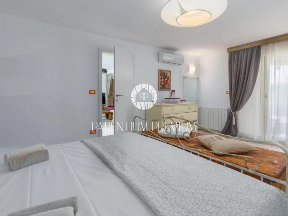 Na 1. katu se nalazi treći stan koji se sastoji od tri spavaće sobe, kupaone, blagovaone, kuhinje te prostranog dnevnog boravka sa velikim balkonom koji pruža pogled na more.