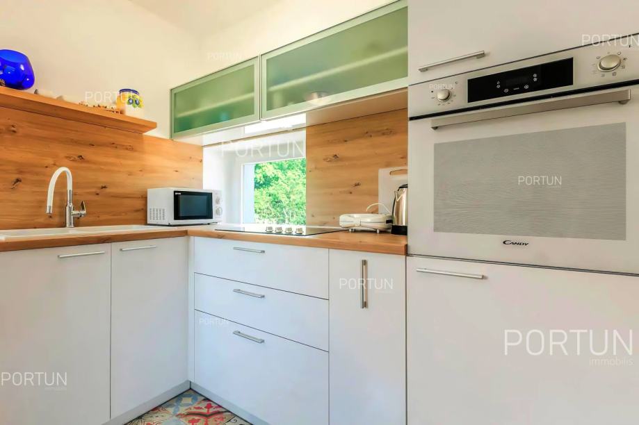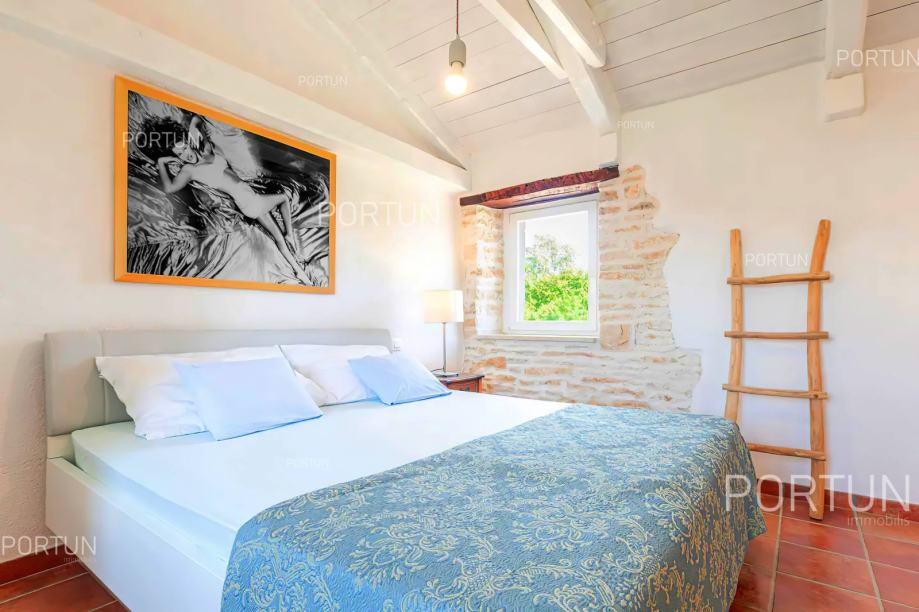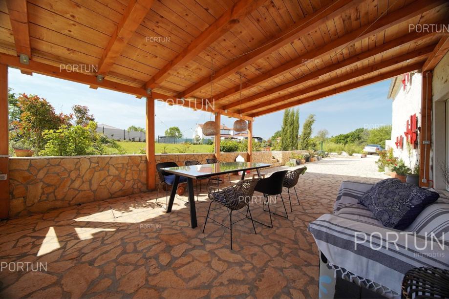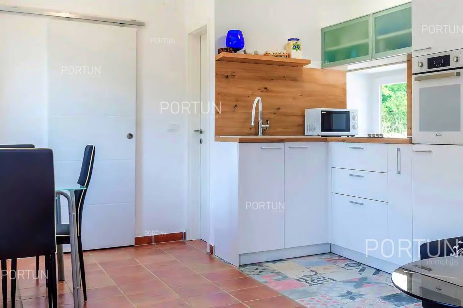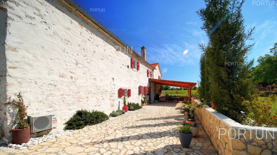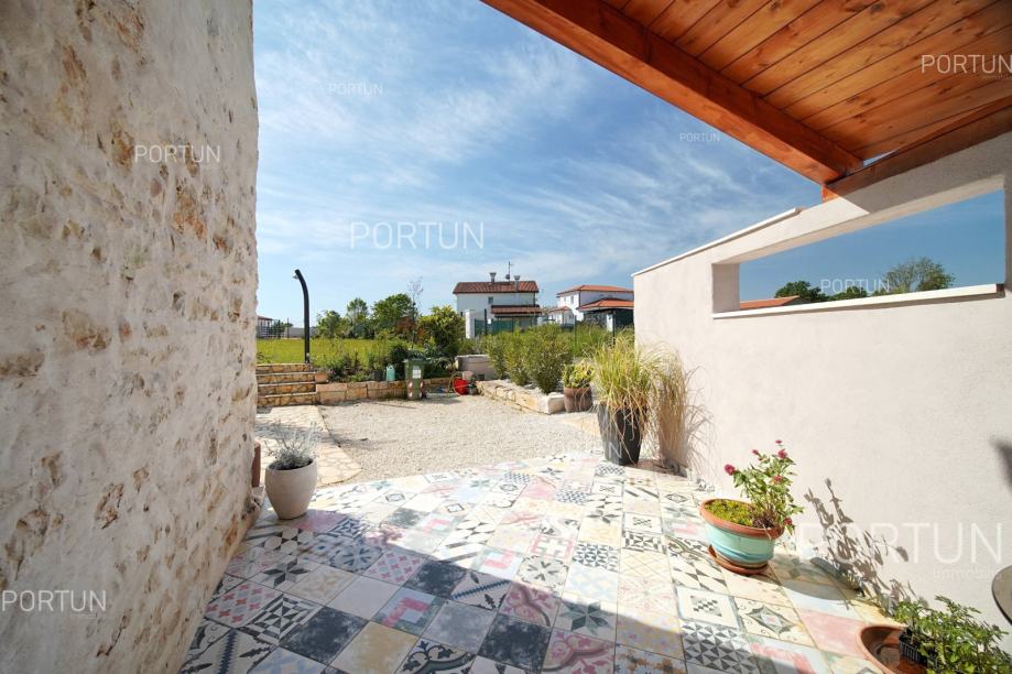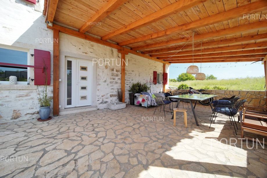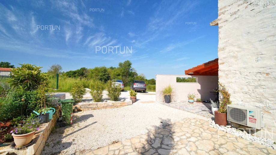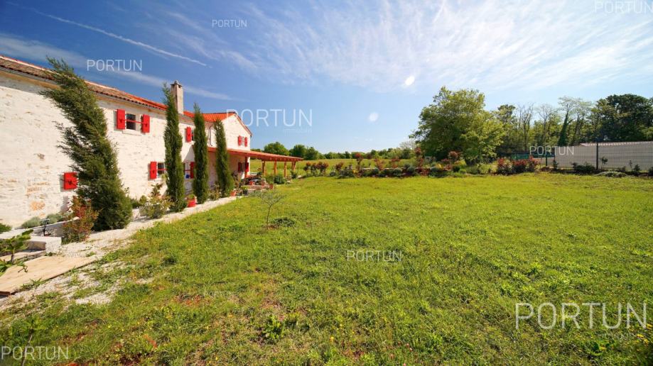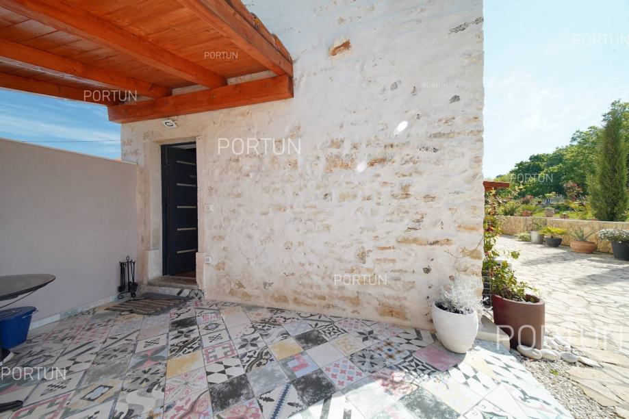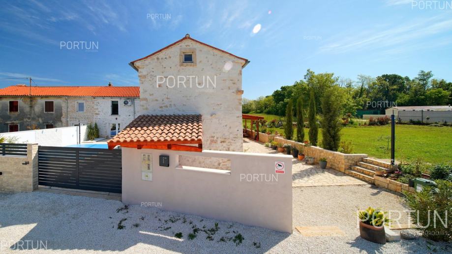 U idiličnom seoskom okruženju, nedaleko Kanfanara, na samo 20-ak kilometara udaljenosti od Rovinja, nalazi se dražesno obnovljena kamena kuća s prostranim dvorištem. Kuća odiše tradicionalnim šarmom, savršeno se uklopivši u autentičan seoski ambijent. Kamena fasada, tradicionalni krov na dvije vode te prozori s žiovpisnim kapcima naglašavaju njezinu karakterističnu ljepotu. Nadstrešnica od drveta pruža ugodan prostor na otvorenom, idealan za opuštanje podalje od sunca ili kiše. Orijentirana prema jugoistoku, kuća nudi prekrasan pogled na vlastito zemljište, koje je prostrano i potpuno ograđeno, a duž granica ukrašeno raznolikim biljkama. Središnji dio zemljišta ostavljen je slobodnim, pružajući mogućnost za eventualno postavljanje bazena ili uređenje vrta. Ova kuća nudi izvanredno rješenje za dvije manje obitelji, sastavljene od dva stana koji zajedno imaju tri spavaće sobe. Manji stan, površine 61,10 m2, smješten je na zapadnom krilu kuće i sastoji se od dnevnog boravka s kuhinjom i blagovaonicom, kupaonice i ostave u prizemlju te spavaće sobe i radne sobe na prvom katu, uz zasebnu natkrivenu terasu. Drugi dio kuće, nešto veći s površinom od 86,80 m2, obuhvaća dvije spavaće sobe i kupaonicu na prvom katu te kuhinju, dnevni boravak, blagovaonicu i kupaonicu u prizemlju. Velika natkrivena terasa koja pripada ovom dijelu kuće savršena je za zajednička druženja i uživanje u mirnom seoskom okruženju. Oba stana nedavno su temeljito renovirana i opremljena novim namještajem, što omogućuje budućem vlasniku brzo i jednostavno useljenje. Ova kuća je idealan izbor za sve koji traže dom za dvije obitelji u seoskom okruženju nedaleko od Rovinja. Veliko dvorište nudi beskonačne mogućnosti, bilo za vlastiti uzgoj hrane, proširenje kuće ili izgradnju bazena, pružajući novom vlasniku širok spektar opcija za oblikovanje prostora prema vlastitim željama i potrebama. KLJUČNE OSOBINE✔ Pitomo selo nedaleko Kanfanara✔ Limski zaljev 13 km - Plaža 20 km ✔ Dvije kuće s ukupno tri spavaće sobe✔ Zemljište 827 četvornih metara✔ Obnovljeno 2023. g.✔ Uporabna dozvola