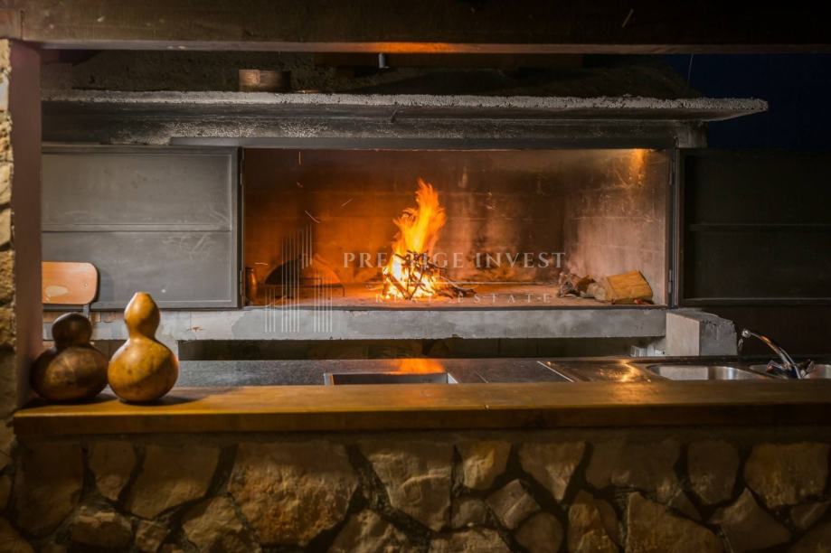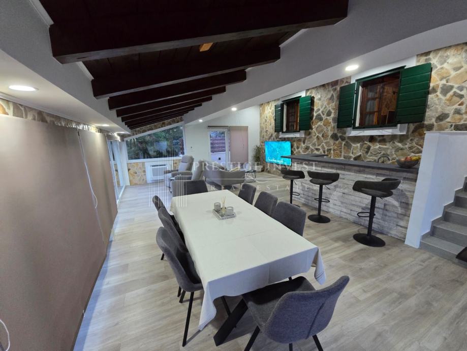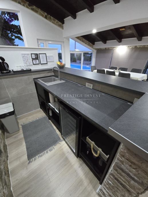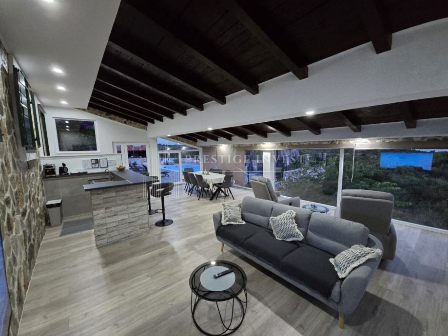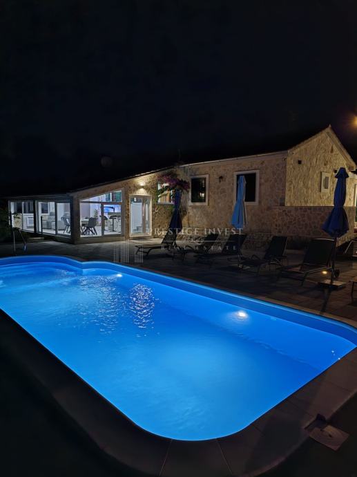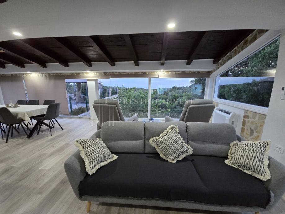 Na prodaju je moderna kamena kuća s prostranom okućnicom, bazenom i panoramskim pogledom na more. Nekretnina je smještena nedaleko od malog turistikog mjesta Rogoznica.
