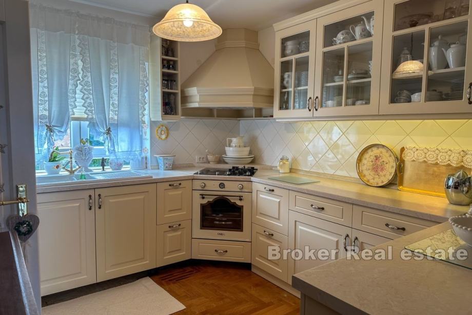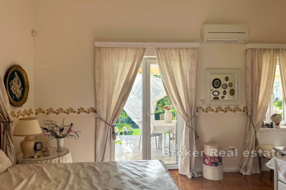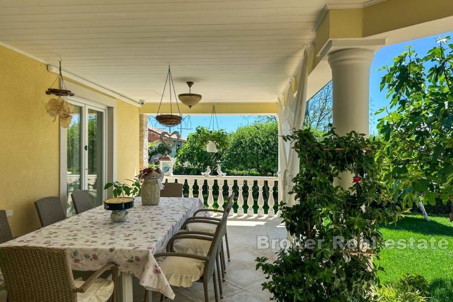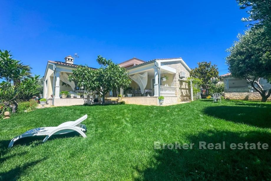Okućnica je pomno uređena kao zeleni vrt, ukrašen stablima maslina, živahnim cvijećem i mirnim jezercem s fontanom. Bujni travnjak opremljen je automatskim sustavom za navodnjavanje koji osigurava cjelogodišnje zelenilo. Na posjedu se nalazi i ljetna kuhinja s pripadajućom ostavom od cca 20 m2, pogodna za kuhanje i okupljanja na otvorenom. Na parceli je predviđeno dodatno spremište za alat, a postoji i građevinska dozvola za dogradnju bazena.