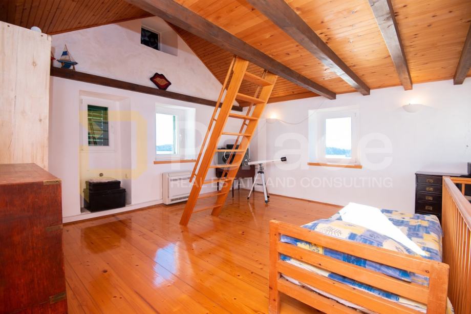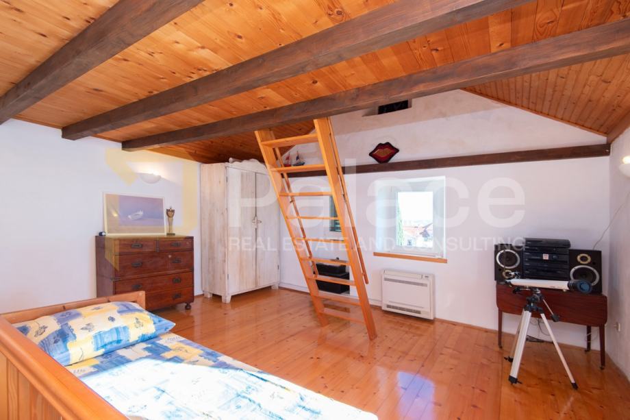 4. kat (visoko potkrovlje): Prava luksuzna oaza – spavaća soba s galerijom i još ljepšim pogledom na grad, more i krovove Šibenika.