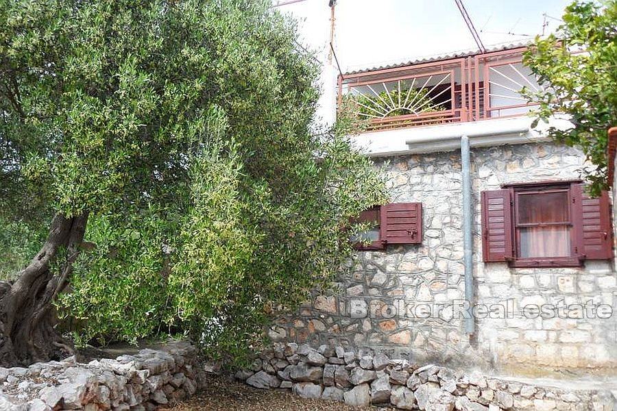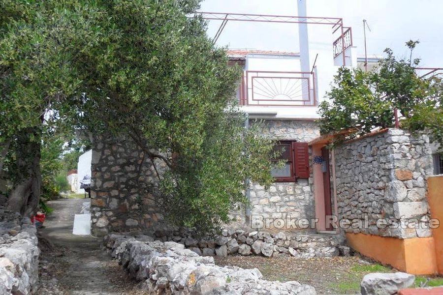 Interesantna dvojna kuća za odmor, sa pogledom na more, na prodaju, smještena na otoku Drveniku u Trogirskom arhipelagu, na parceli od 110 m2, ukupne stambene površine od 105 m2, podijeljenih na podrum (24 m2), prizemlje i kat.