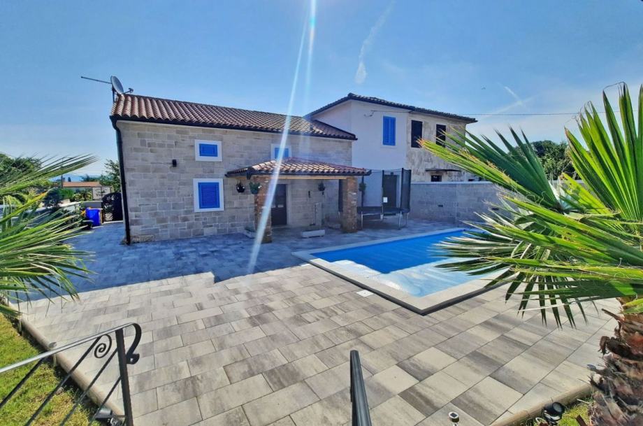 Otok Krk, Malinska, šire područje, prodaja nove dvojne kamene kuće površine 150 m2, s bazenom i uređenom okućnicom površine 276 m2, na mirnoj lokaciji! Kuća se sastoji od prizemlja s ulaznim prostorom, dnevnom sobom, kuhinjom, blagovaonom, stubištem, kupaonicom, vešerajem i spremištem te prvog kata s tri spavaće sobe, dvije kupaonice, toaletom, hodnikom i stubištem. Visoka kvaliteta gradnje i opreme, klimatizacija, dva parkirna mjesta. Udaljenost od plaže i centra Malinske 3000 m.