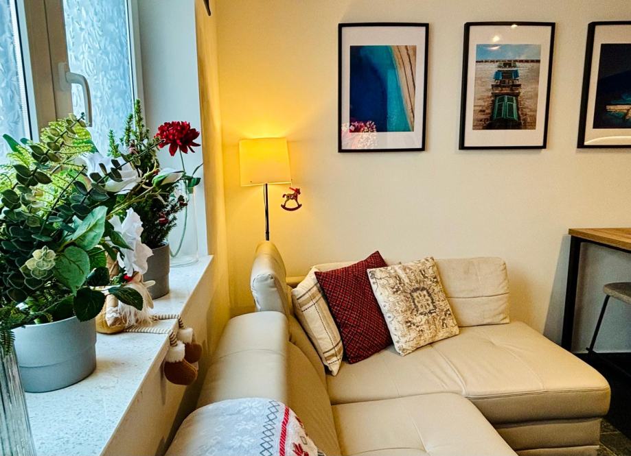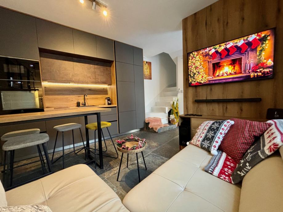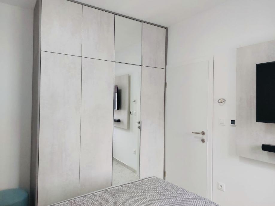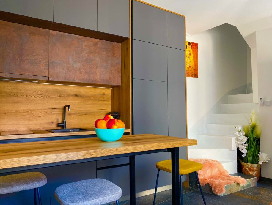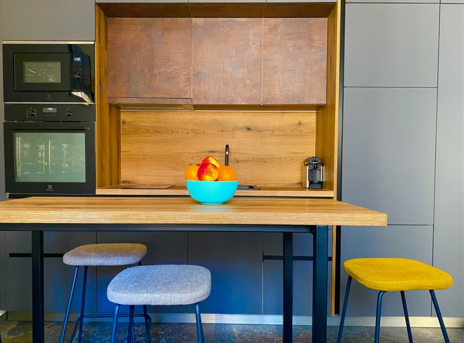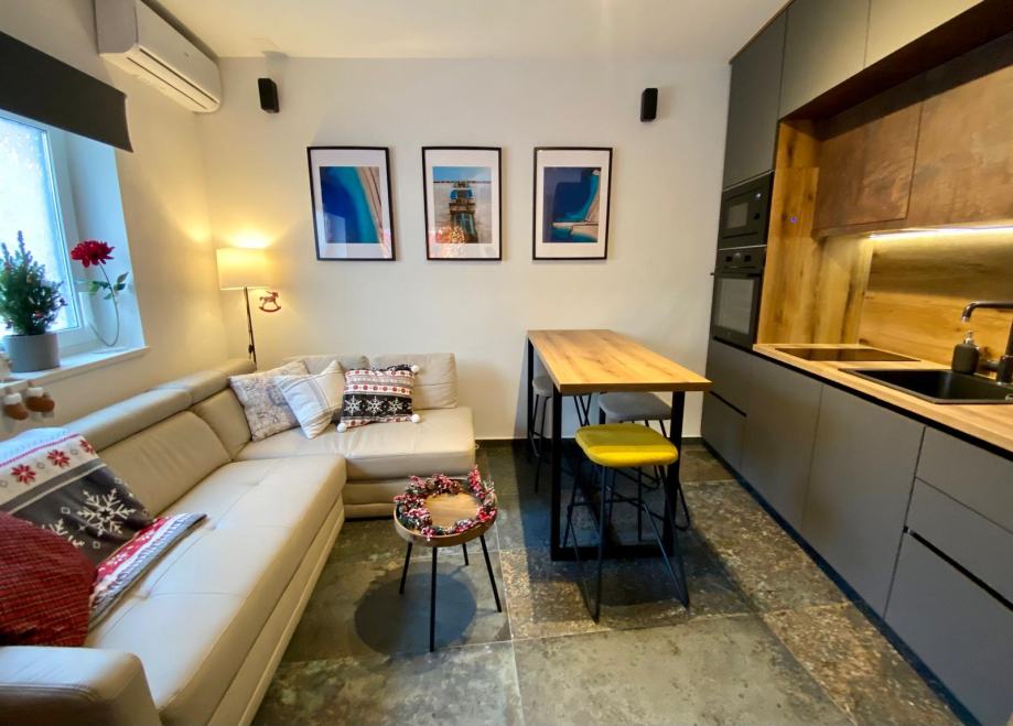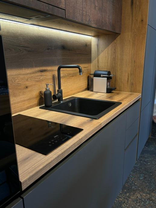 Kuhinja je rađena po mjeri s visokokvaltetnim materijalima i frontama na kojima ne ostaju otisci, opremljena je kvalitetnom tehnikom Electrolux/AEG: hladnjakom koji sadrži i tri ladice ledenice, pećnicom, mikrovalnom, perilicom posuđa, espresso aparat, indukcijskom pločom za kuhanje, usisavačem.