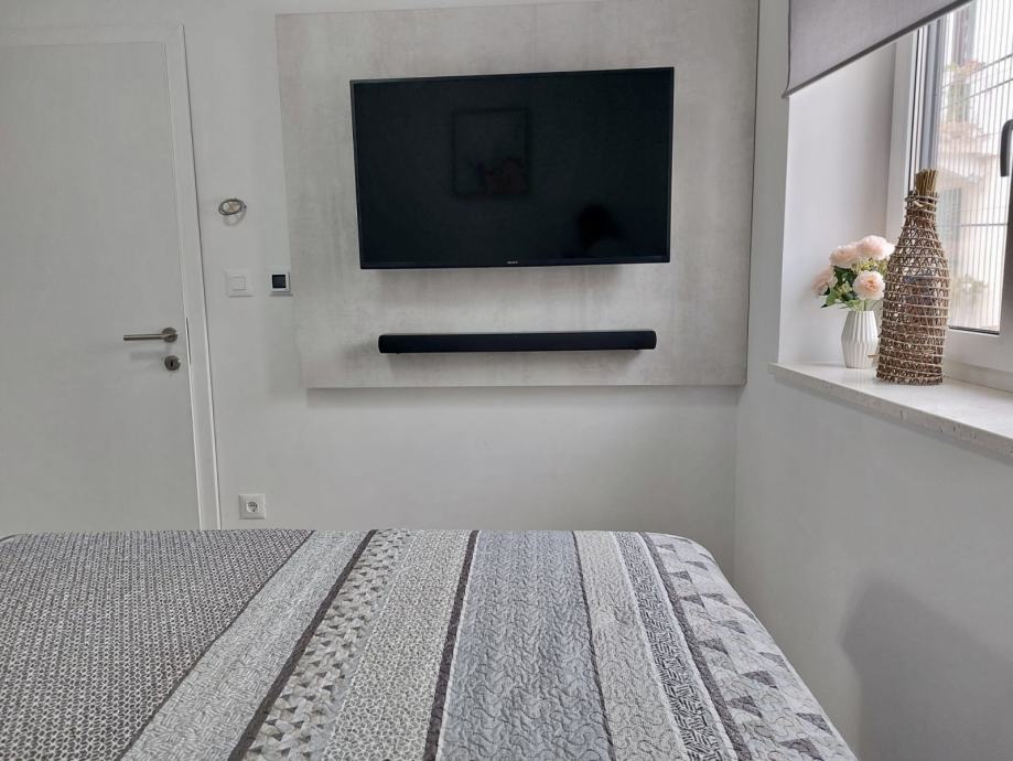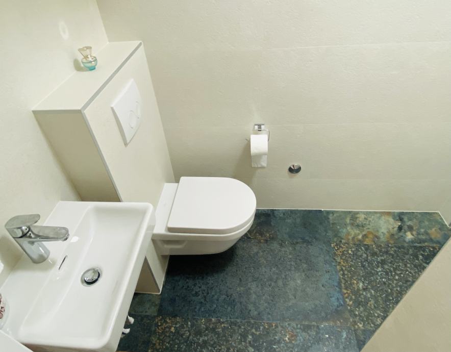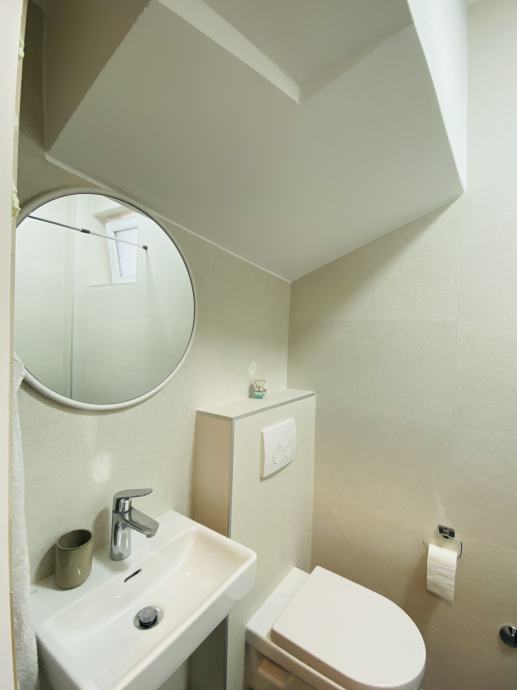 Na prvom katu je prostrana spavaća soba s krevetom dim. 160 x 200 cm te se kreveti mogu i po potrebi razdvojiti, veliki dvokrilni ormar s ladičarom i ogledalom, dva noćna ormarića, tabure, TV ravnog ekrana i kućno kino, klima Haier, podno grijanje. Na istoj etaži se nalazi još jedna prostrana kupaonica s tuš kadom i perilicom/sušilicom za veš, Villeroy&Boch, Grohe sanitarije, moderan tanki strujni bojler za cijelu kuću.