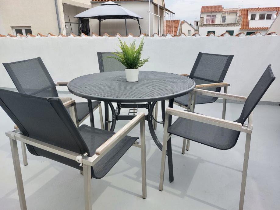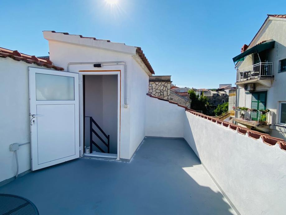 Na drugom katu kuće nalazi se prostrana terasa od 20 m2 sa stolom i stolicama na kojoj možete uživati te ima pogled 360 na vizuru starog grada Vodica. Terasu je moguće pretvoriti u stambeni prostor sukladno prostornom planu.