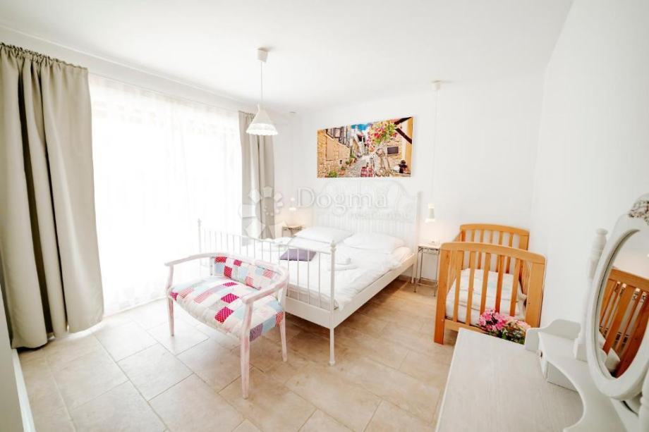 Unutarnje stepenište vodi na kat, gdje su smještene tri lijepo uređene spavaće sobe. Na raspolaganju su dvije kupaonice — jedna prostrana kupaonica s jacuzzijem i tušem, te druga kupaonica s tuš kabinom. Iz jedne spavaće sobe pruža se izlaz na balkon s prekrasnim pogledom na vrt, bazen i zelenilo, gdje se jedini zvukovi koji remete tišinu svedu na cvrkut ptica.